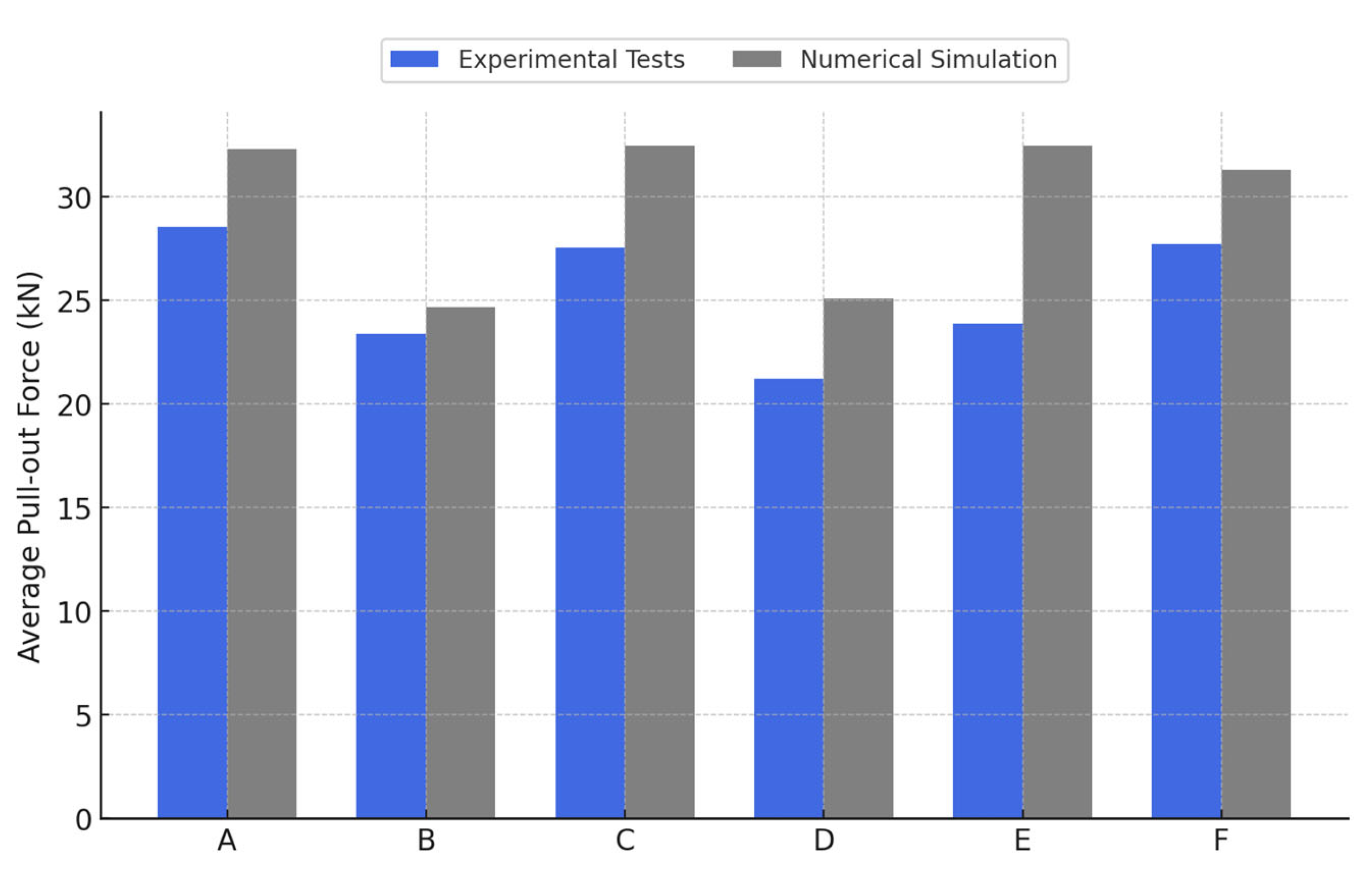 An analysis comparing the results obtained through numerical simulation in ANSYS and those from the experimental tests revealed a significant correlation, both in terms of the maximum pull-out force values and the observed failure modes. This agreement, as graphically illustrated in
