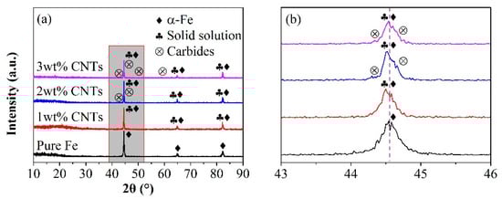 (a) XRD patterns of Fe-CNT composites with different CNTs contents; (b) partial enlarged image.