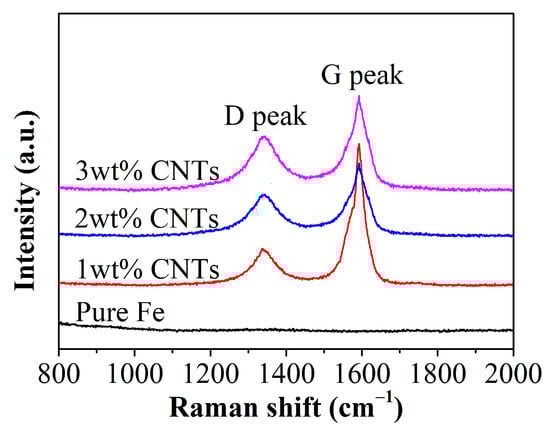 Raman spectroscopy was utilized to assess the structural stability of carbon nanotubes (CNTs) by conducting tests and analyses on a composite powder of Fe-CNT, as depicted in Figure 2. The results reveal that all samples demonstrate two distinctive peak positions characteristic of CNTs: the D band at approximately 1344 cm−1 and the G band at around 1598 cm−1. Specifically, the G band is attributed to the graphite structure of sp2 hybridized carbon bonds, whereas the D band is associated with defects within the graphite structure.