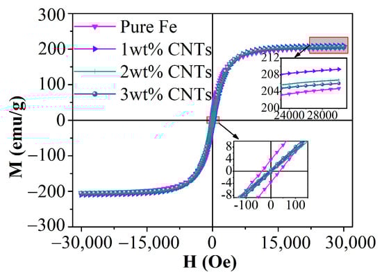 Carbon nanotube-doped metal matrix composites, including aluminum, magnesium, copper, titanium, silver, nickel–aluminum, nickel–iron, iron–cobalt, and iron, are of significant interest for high-strength and lightweight structural applications. Research in this area has primarily concentrated on process challenges, mechanical characteristics, and reinforcement mechanisms, leading to notable advancements [1,2,3,4]. For instance, incorporating CNTs into Al through high-energy ball milling and adding 15 vol% carbon nanotubes to a copper matrix enhances yield strength [5]. For the Cu-Ti alloy, it achieves a tensile yield strength of 515 MPa, tensile strength of 542 MPa, elastic modulus of 95.6 GPa, and elongation of 10.4%. In the iron–cobalt alloy, 0.5 vol% carbon nanotubes boost hardness by 18% (1 vol% graphene nanoplatelets) and achieve a maximum magnetic induction of 2.39 T [6]. Notably, research on carbon nanotube-reinforced iron-based composites is limited, primarily focusing on mechanical properties like hardness and strength [1,7,8,9,10,11], with minimal exploration of their magnetic characteristics [12,13,14,15,16]. Consequently, further investigations into the structure and magnetic properties of carbon nanotube-reinforced iron-based composites are warranted.