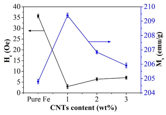 Figure 4 illustrates the hysteresis loops of the Fe-CNT composites, demonstrating consistent ferromagnetic characteristics across all samples. The findings reveal an enhanced saturation magnetization (Ms) and a reduced coercivity (Hc) in the Fe-CNT composites compared to pure iron powder, as evidenced by the detailed analysis provided in the figure.
