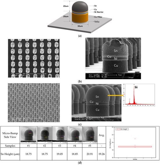 Design and fabrication of a pure Sn bump with a diameter of 30 μm. (a) A vertical structure of microbumps; (b) SEM images of the planar and the side surface after top layer pure Sn plating; and (c) the side surface image of a 30 μm diameter bump manufactured after reflowing (SEM side view). (d) Height of pure Sn after reflowing (SEM side view).