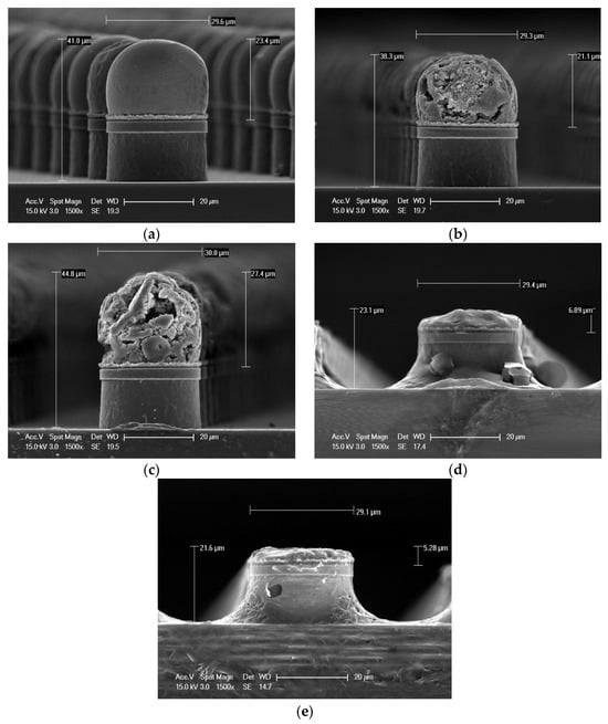 Figure 2 shows an experiment to determine the optimal etching time to remove only Sn using a sample of solder cap Sn bump 1. The etching times were 0, 5, 10, 15, and 20 min. After etching the solder cap Sn, the side surface at each time point was analyzed using SEM. Figure 2a shows the side surface shape before etching. At 5 min of etching, l removal of material can be seen at the outer surface of the solder cap Sn. At 10 min, removal proceeded toward the inside of the bump. At 15 min, almost all the cap Sn was etched, although some remained on the top surface of the bump. In the sample etched for 20 min, all Sn was removed. A 1 μm Cu layer formed on the Cu pillar/Ni barrier during reflow. The Sn-etched sample was immersed in acetone and ethanol and then sonicated for debris removal. It was confirmed that SupraBond RO-22 from Hojin Platech can selectively strip tin to leave an intermetallic layer.
