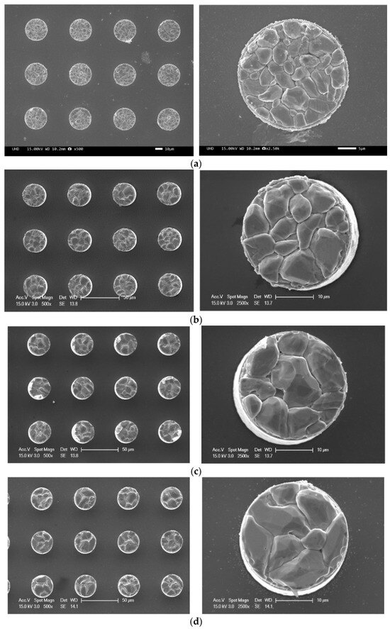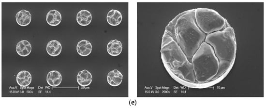 Figure 3 shows the planar SEM views of the etched solder cap Sn layer for the five samples presented in Table 1. For each sample, 12 bumps were imaged. The left image of Figure 3a shows SEM images of each of the 12 bumps, and the right image shows the surface condition of one of the bumps, enlarged. The grain and grain shape can be confirmed. Figure 3b–e also compare the surface condition according to each condition. The grain shapes of the IMC, an alloy of Sn and Cu, were irregular and small. With one reflow cycle, the plane view showed small, densely packed bumps. With three reflow cycles, slightly larger grain sizes were observed due to combinations of small IMC grains. Five reflow cycles showed a smaller number of even larger IMC grains. This pattern continued with additional reflow cycles. In brief, as the number of reflow cycles increased, the distance and depth of the curvature between the IMC grains increased.