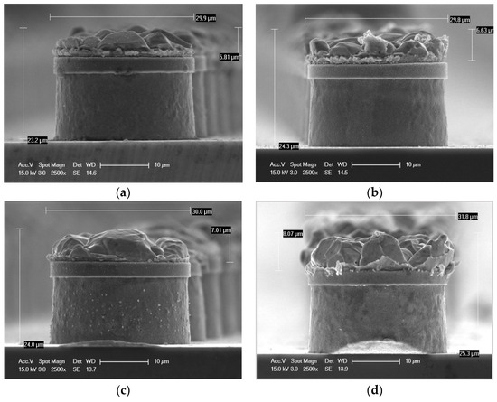 Figure 1a shows the vertical structure of a Sn bump with a height of 40 μm and a diameter of 30 μm. Figure 1b shows SEM shape of the planar and a side surface manufactured through plating before reflowing. The diameter and spacing of the bumps on wafer were 30 μm and 55 μm, respectively. The fabrication process involved depositing 1000 Å of Ti/2000 Å of Cu on a wafer, applying a 40 μm-thick dry film, and then opening a via using a photolithography process. A 20 μm Cu layer, a 3 μm Ni layer, and a 1 μm Cu layer were formed in the opened via hole. Finally, 20 μm-high pure Sn was formed by electroplating. After removing the dry film, the Ti and Cu were etched away. The electroplating process was performed at a distance of 155 mm from the electrodes and 65 mm from the cathode. Under current density 9ASD, temperature 30 °C, and 3.5 Lt/min, Sn was plated at a thickness of 20 μm [27]. Figure 1c is a vertical SEM image of a bump with a height of 40 μm and a diameter of 30 μm manufactured by the reflow process under the same conditions as for the sample of Figure 1b. The Sn bump formed by plating was performed after applying flux to the bump before reflowing. Reflow was performed 1, 3, 5, 7, and 10 times for each of the 5 samples prepared. Reflow was carried out in five stages as follows: 1st rising section (0–50 s @ 170 °C), preheating section (50–200 s @ 180 °C), 2nd rising section (200–250 s @ 240 °C), reflow section (250–300 s @ 246 °C), and cooling section (300–350 s @ 30 °C). The manufactured samples were prepared according to the number of reflow cycles. Figure 1d shows the height of pure Sn using a SEM side view after reflowing. The average Sn height of five samples is approximately 19.26 μm. The distribution is shown in the box plot on the right.