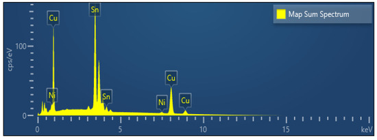 Figure 5 shows a compositional analysis of the surface condition of the Sn-etched microbump. The results of the compositional analysis are shown in Table 2. As shown in Table 2, atomic composition analysis was performed using EDS on the plane of the Sn-etched microbump. If Sn had been etched to a smaller degree, the Sn component would have been dominant. However, as shown in the table, the detection of Cu, Sn, and Ni indicates that all solder cap Sn was etched. In addition, the detection of mainly Cu (40.56 wt%) and Sn (58.34 wt%) components represent an oxide alloy.