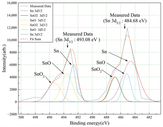 Figure 6 analyzes the oxide composition of the Cu and Sn components in Figure 5. Figure 6 is the X-ray photoelectron spectroscopy spectrum (model K-alpha plus) of Sn 3d on the top surface of the wet-etched bump. Fit of the oxide composition data of Sn 3d5/2 and Sn 3d3/2 using measured Sn 3d scan data. As shown in Figure 6, the measured Sn 3d scan data are used to fit the oxide composition data of Sn 3d5/2 and Sn 3d3/2. The binding energy of 484.68 eV corresponds to Sn 3d5/2, and the binding energy of 493.08 eV corresponds to Sn 3d3/2. The XPS mapping results for the measured results of Sn 3d5/2 and 3d 3/2 confirmed oxides in the forms of SnO and SnO2.