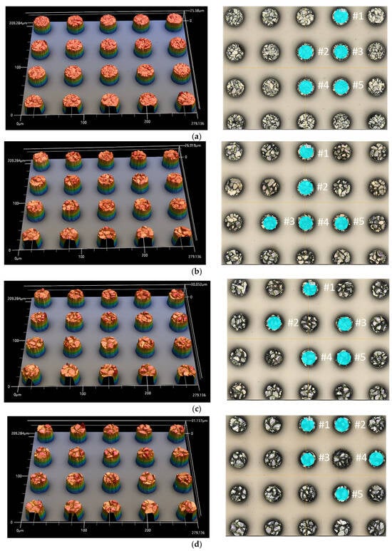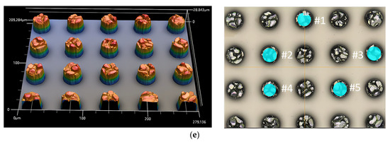 Figure 7a is a 3D microscope photograph of the surface of the Sn-etched bumps after one reflow cycle. Five bumps were randomly selected from the twenty bumps for each condition. The five-bump planes were designated as circular areas (blue), and the roughness (Ra, Rz) for each area was measured. Similarly, the grain surface shape, number, and roughness were analyzed for the samples that were reflowed 3 times (Figure 7b), 5 times (Figure 7c), 7 times (Figure 7d), and 10 times (Figure 7e).