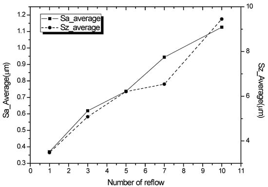 Figure 8 compares the average Sa and Sz according to reflow for the measured data in Table 4. As in the Sa graph, the roughness increases proportionally as the number of reflow cycles increases. The average Sa is 0.370 μm at reflow 1 but increases linearly by almost three times to 1.126 at reflow 10. This can be confirmed by increase in depth between the valleys as the grain sizes of the IMC merge and increase in size.