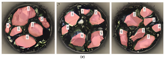 Surface area and number of IMC grains formed on a bump using a 3D microscope: (a) number of grains after 1 reflow, (b) number of grains after 3 reflows, (c) number of grains after 5 reflows, (d) number of grains after 7 reflows; and (e) number of grains after 10 reflows.