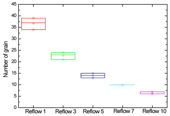 Figure 9 analyzes the number of grains for each sample captured by the 3D scope. Table 4 counts the grains formed on the bump plane according to the reflow conditions. For three bumps, the average number of grains for 1 reflow was 36.67. For 3 reflows, the average number of grains was 22.67. For 5 reflows, the average number of grains was 14. For 7 reflows, the average number of grains was 10. For 10 reflows, the average number of grains was 6.33. As shown in Figure 10, the number of grains decreased rapidly and proportionally from 1 to 5 reflows but gradually decreased from 7 to 10 reflows.