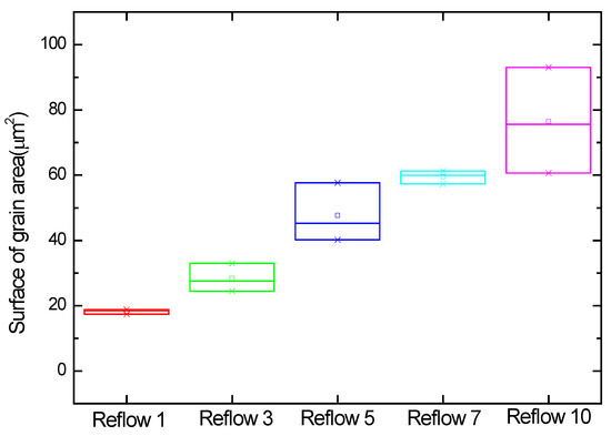 Table 5 shows the surface area analysis of grains formed on the bump plane. Keyence VK-X3050 is a laser microscope that uses triple scanning to analyze the surface area by measuring the three-dimensional shape and surface of a target object in a non-contact manner [27]. The average surface area of the 1 reflow was measured as 18.243 μm2, the average surface area of 3 reflows was 23.325 μm2, and the average surface area of 5 reflows was 47.669 μm2. The average surface area of 7 reflows was measured as 59.506 μm2, and the average surface area of 10 reflows was measured as 76.431 μm2. As shown in Figure 11, the average surface area of the IMC grains formed under each condition increased proportionally overall.