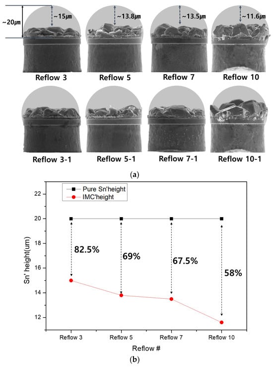 IMC analysis for the side surface of bumps according to reflow cycle. (a) The side surface shape of IMC according to number of reflow cycles (calculation example = (15/20) * 100, pure Sn’ height: 20 μm) and (b) reduction in the height of pure Sn according to the number of reflows.