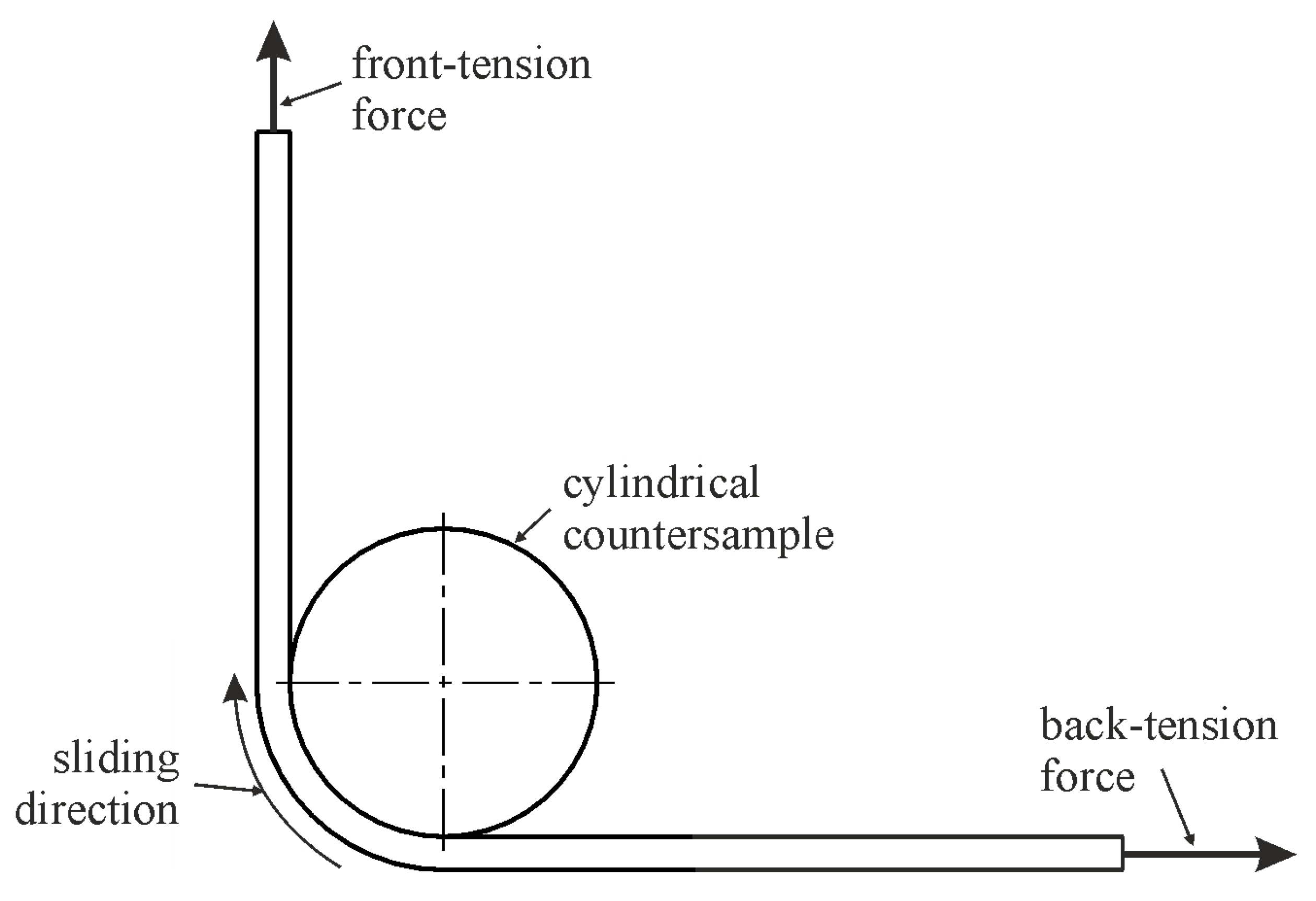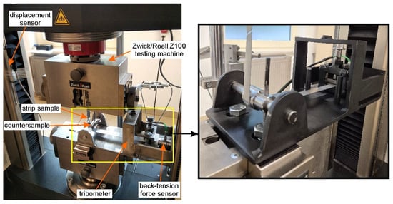 The test involves stretching a strip of sheet metal around a 145Cr6 tool steel countersample with a diameter of 30 mm. The tests were conducted on the test stand shown in Figure 1, where one end of the sample was fixed in a specially constructed holder. The other end of the sample was mounted in the upper holder of a Zwick/Roell Z100 testing machine. The movement of this holder caused sample elongation whilst simultaneously bending it around the cylindrical countersample. The sample was stretched until it broke. The tests were carried out at an ambient temperature (21 °C). The testing machine was responsible for recording the front-tension force (FTF), while the back-tension force (BTF) was measured using a Kistler 9345B piezoelectric force sensor (Kistler, Winterthur, Switzerland). Based on both the FTF and BTH forces, the change in the friction coefficient μ value during the BUT test was determined according to Equation (1) [32]: