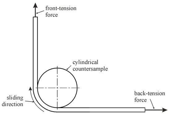 The friction tests were performed using a self-designed bending under tension friction tester, as shown in Figure 1. The detailed design of this tribotester was previously described in [31]. The test samples were DC01 steel strips cut from a 0.8 mm thick sheet in the rolling direction. Each sample was 18 mm wide and 400 mm long.