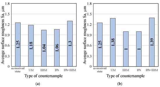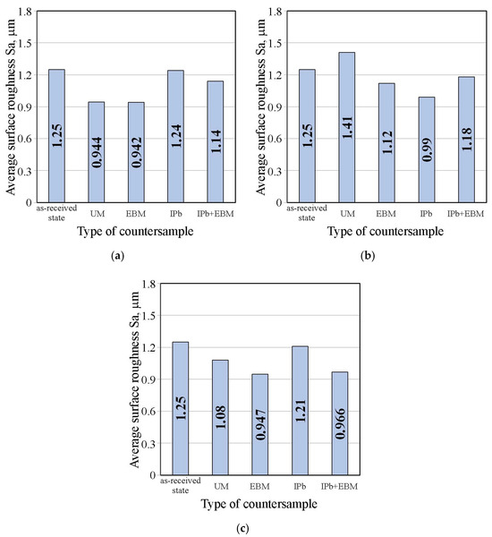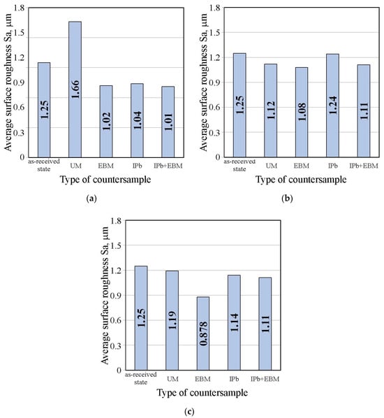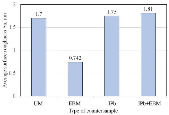 Values of basic surface roughness parameters of the countersamples are presented in Figure 4. The surfaces of the countersamples were characterised by the average surface roughness Sa [34]. The average roughness values varied between 0.742 μm and 1.810 μm depending on the type of countersample used.