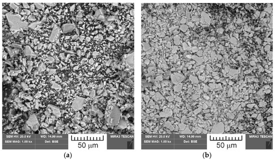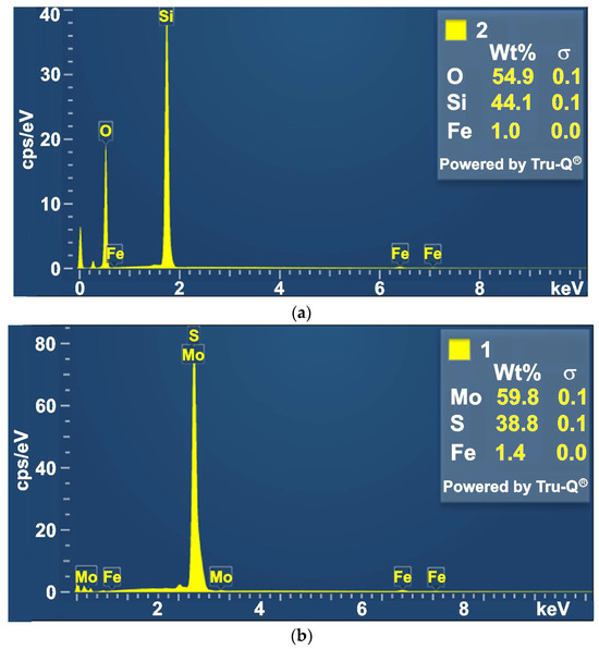 The powders used in the study were examined for particle size and chemical composition. A TESCAN MIRA3 scanning electron microscope (SEM) was used for the microstructural analysis. Figure 5 shows SEM images of the powders used. The size of the major fraction of SiO2 particles was between 5 and 18 μm. The size of the major fraction of MoS2 particles was between 5 and 15 μm; however, smaller and larger particles were also observed. The results of the analysis of the powder’s chemical composition are presented in Figure 6.