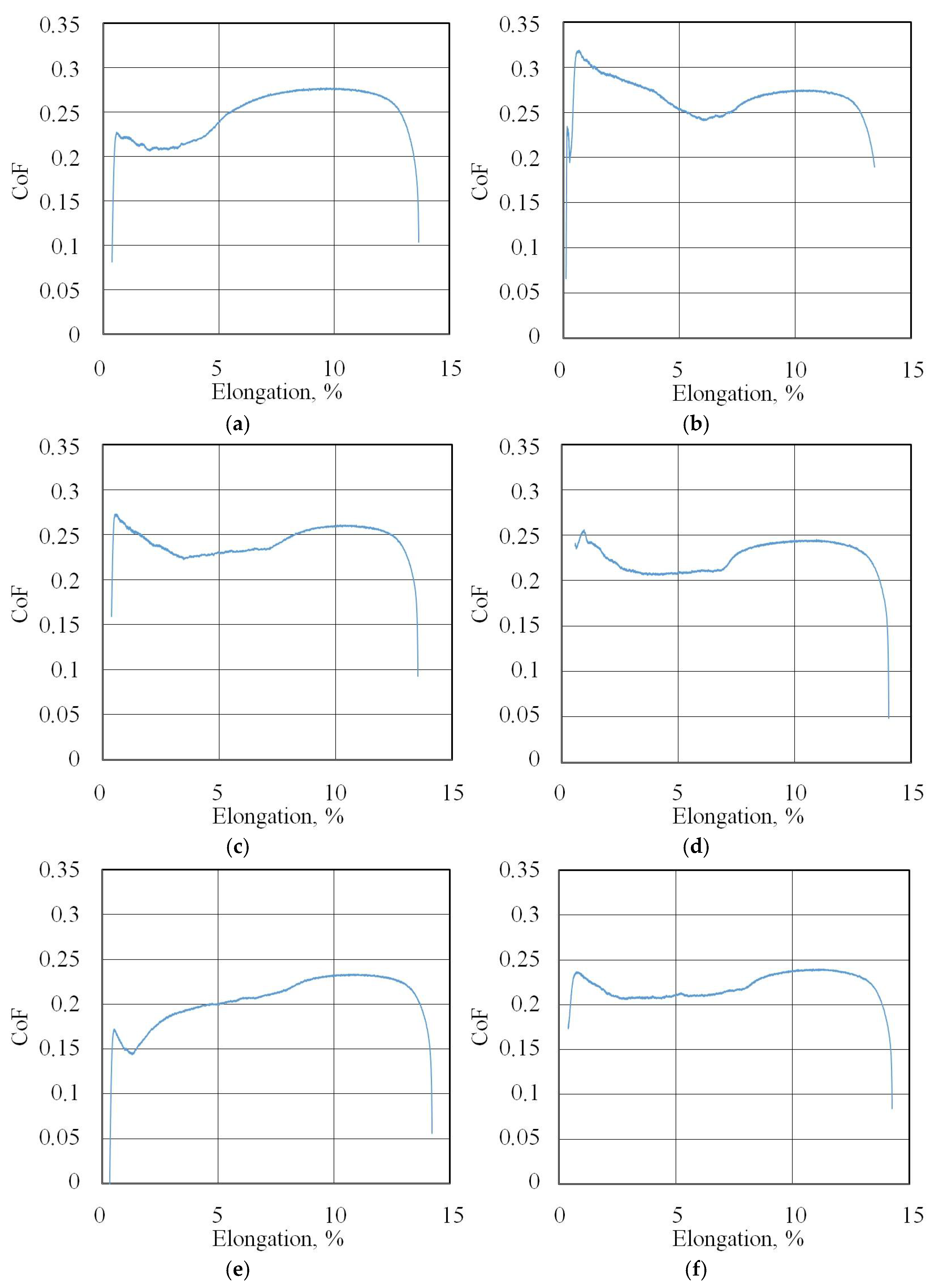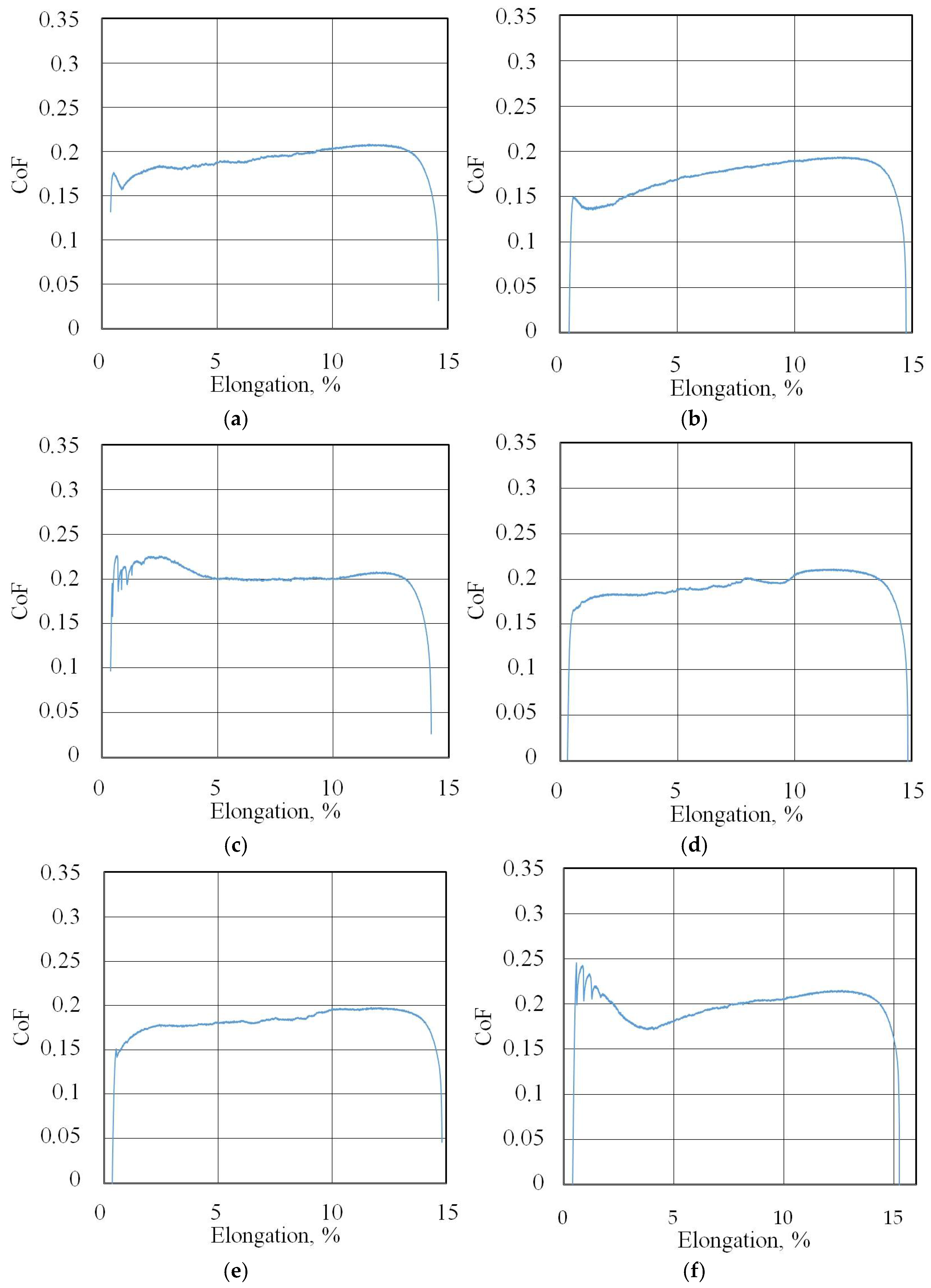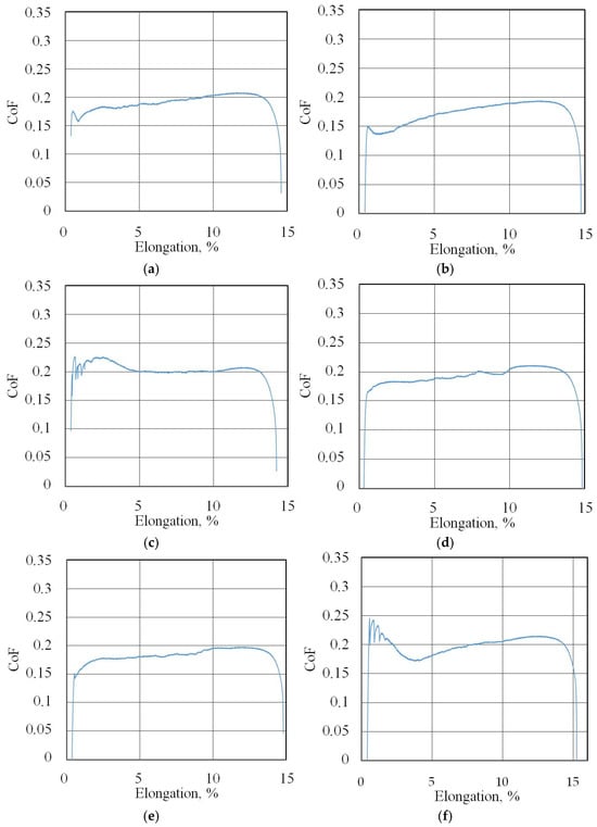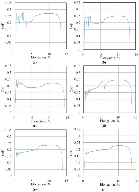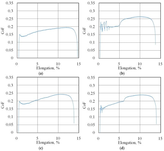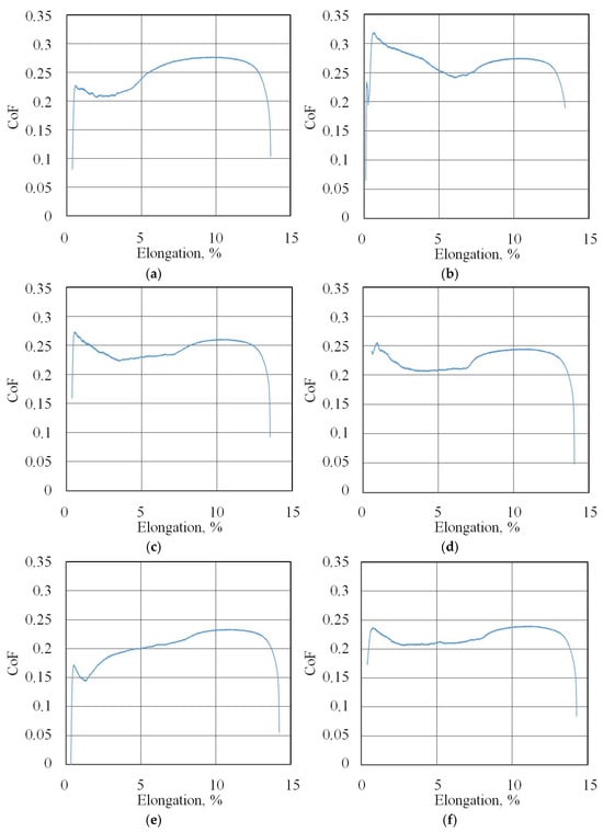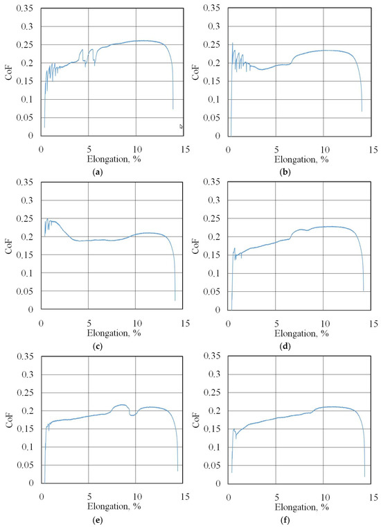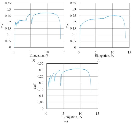 Figure 7 shows the changes in the FTF and BTF during the BUT test and the corresponding change in the CoF value for the EBM countersample. Due to the continuous change in surface topography associated with sample stretching and the change in the sheet’s mechanical properties resulting from the work-hardening phenomenon, the CoF value is subject to continuous change [33]. Therefore, for comparison purposes, the maximum value of the coefficient of friction determined for sample elongation greater than 6% was adopted (Figure 8). Initially, the value of the force parameters increases rapidly as a result of overcoming the material’s resistance to deformation in the elastic strain range. Subsequently, the sample undergoes plastic deformations associated with the strain hardening. The strength of the strip sample is limited and at a certain point, there is a localised reduction in a specimen’s cross-sectional area, which corresponds to the maximum FTF; a subsequent reduction in the force parameters was observed.