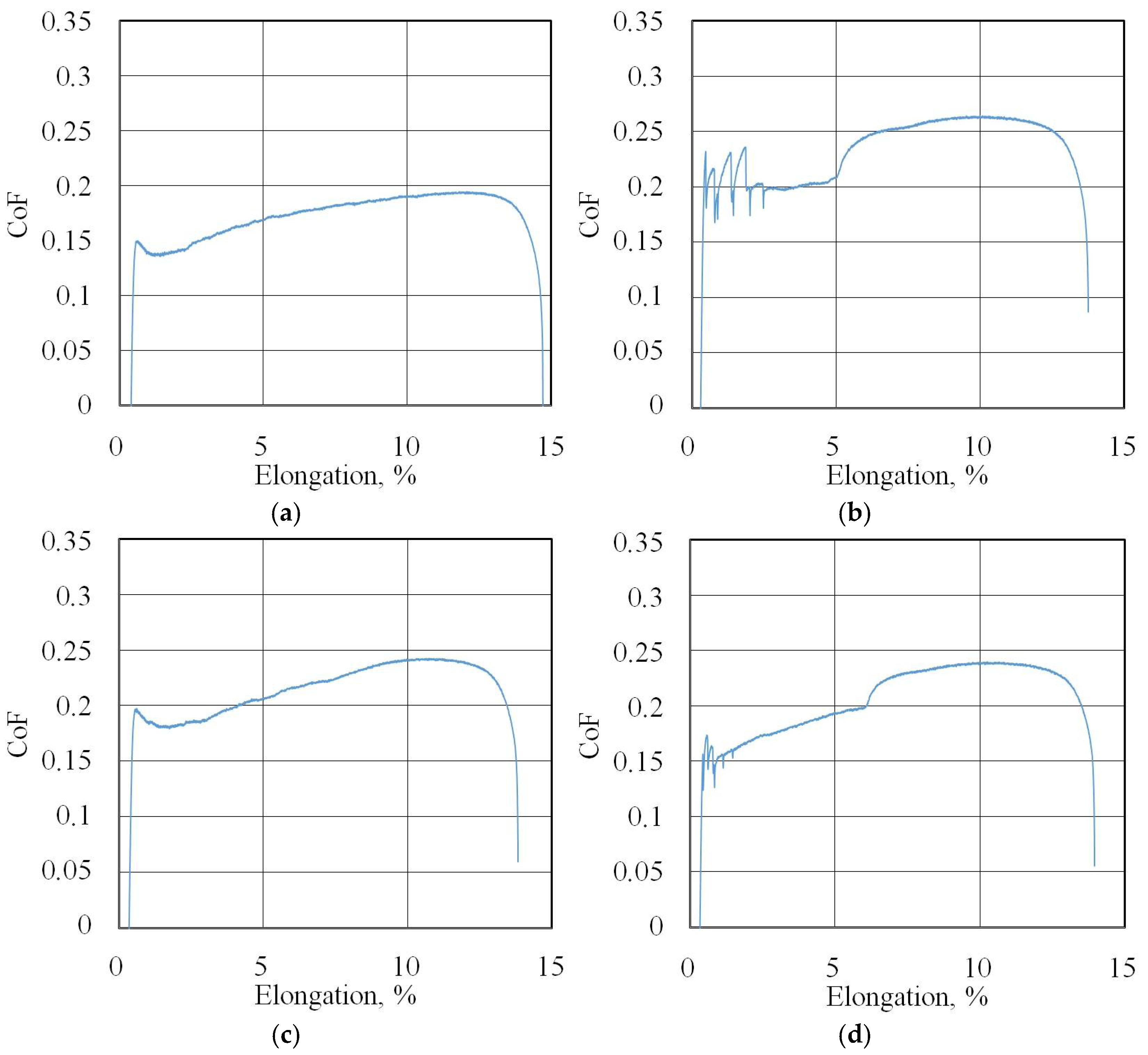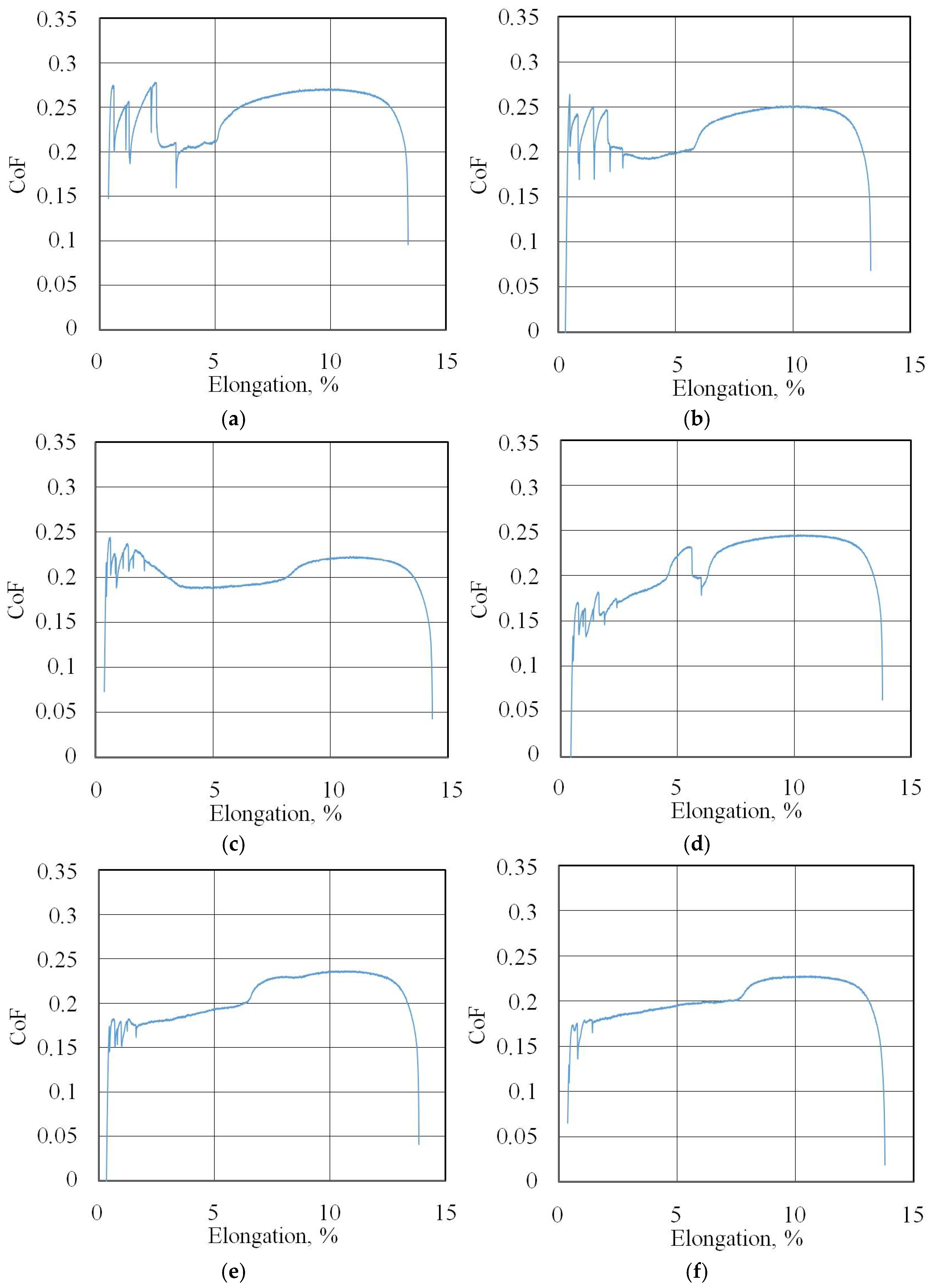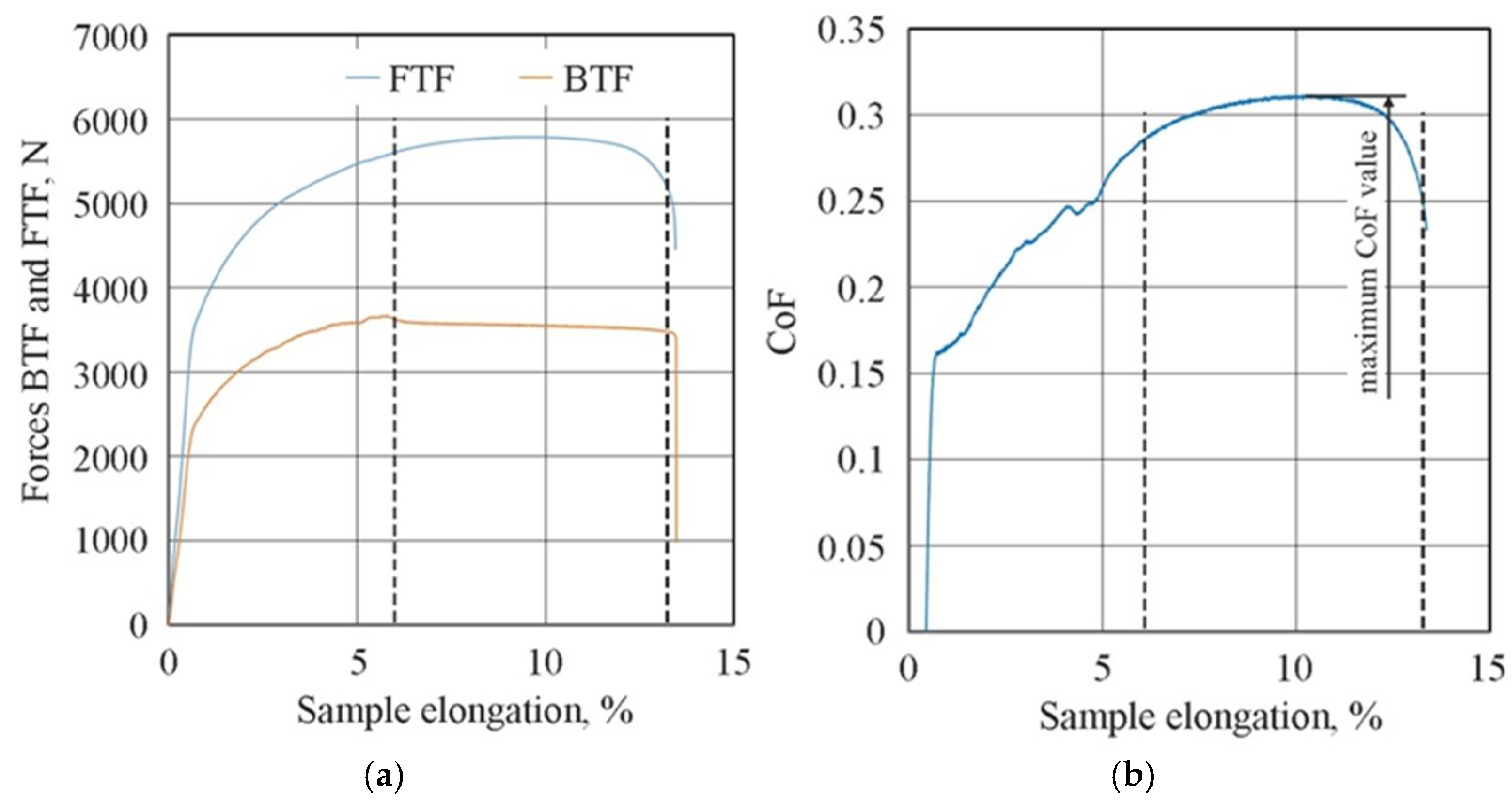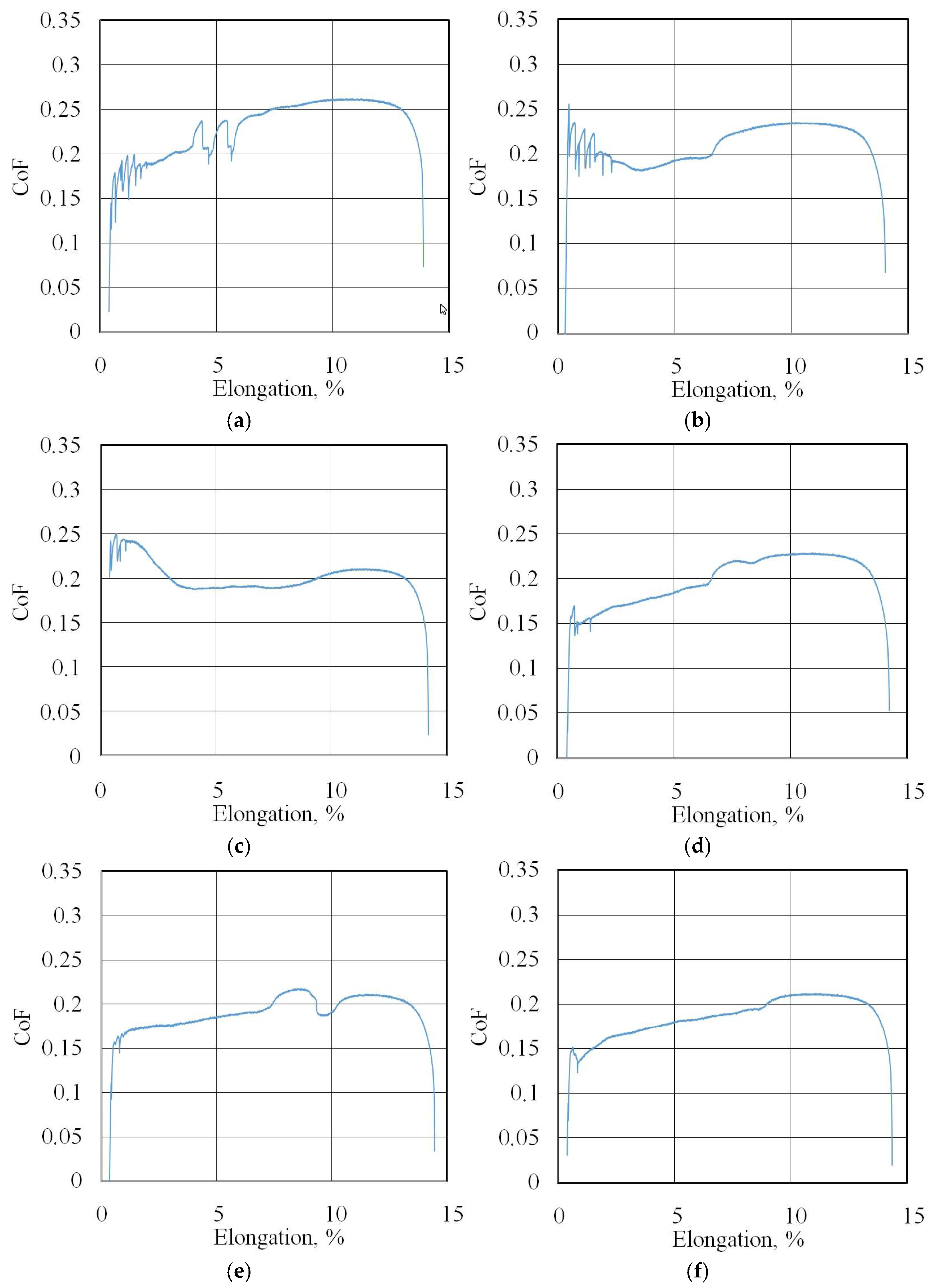Figure 7 shows the changes in the FTF and BTF during the BUT test and the corresponding change in the CoF value for the EBM countersample. Due to the continuous change in surface topography associated with sample stretching and the change in the sheet’s mechanical properties resulting from the work-hardening phenomenon, the CoF value is subject to continuous change [33]. Therefore, for comparison purposes, the maximum value of the coefficient of friction determined for sample elongation greater than 6% was adopted (Figure 8). Initially, the value of the force parameters increases rapidly as a result of overcoming the material’s resistance to deformation in the elastic strain range. Subsequently, the sample undergoes plastic deformations associated with the strain hardening. The strength of the strip sample is limited and at a certain point, there is a localised reduction in a specimen’s cross-sectional area, which corresponds to the maximum FTF; a subsequent reduction in the force parameters was observed.