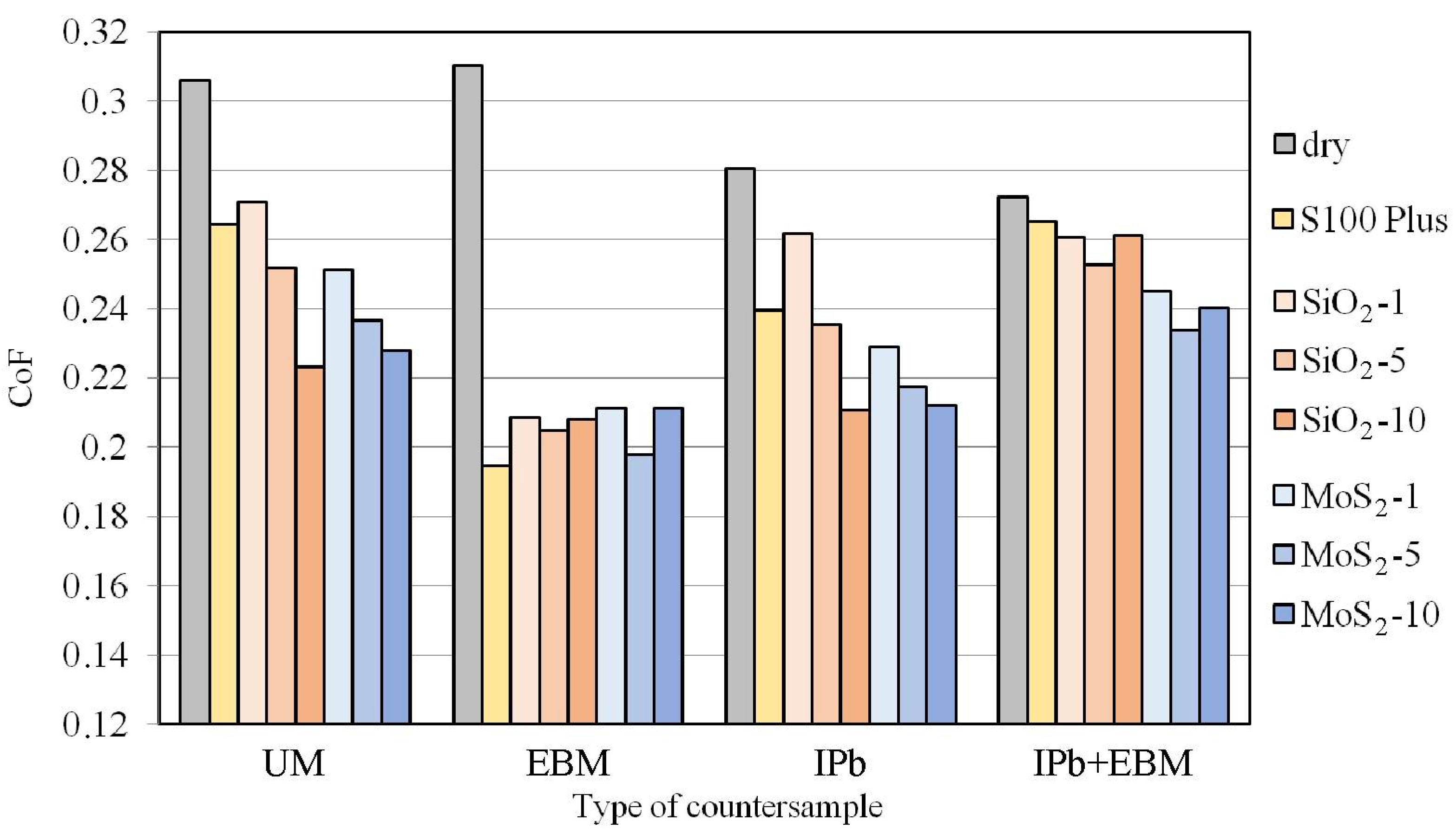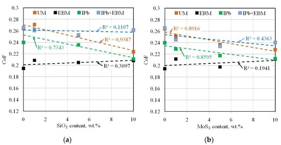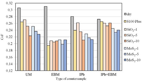 The UM and IPb countersamples reduced the CoF with increasing MoS2 content in the lubricant (Figure 15). The largest reduction in CoF with the modified oil (by 19.5%) was observed for the IPb countersample and with oil containing SiO2 additive (Figure 15a). Only the EBM and IPb + EBM countersamples showed a similar effect on CoF for both powder additives. In the case of the EBM countersample, the SiO2 and MoS2 additives increased the friction coefficient compared to the lubrication conditions with pure S100 Plus oil. The opposite relationship was observed for the IPb + EBM countersample. The use of SiO2 (Figure 15a) and MoS2 (Figure 15b) additives reduced the CoF compared to the base oil.