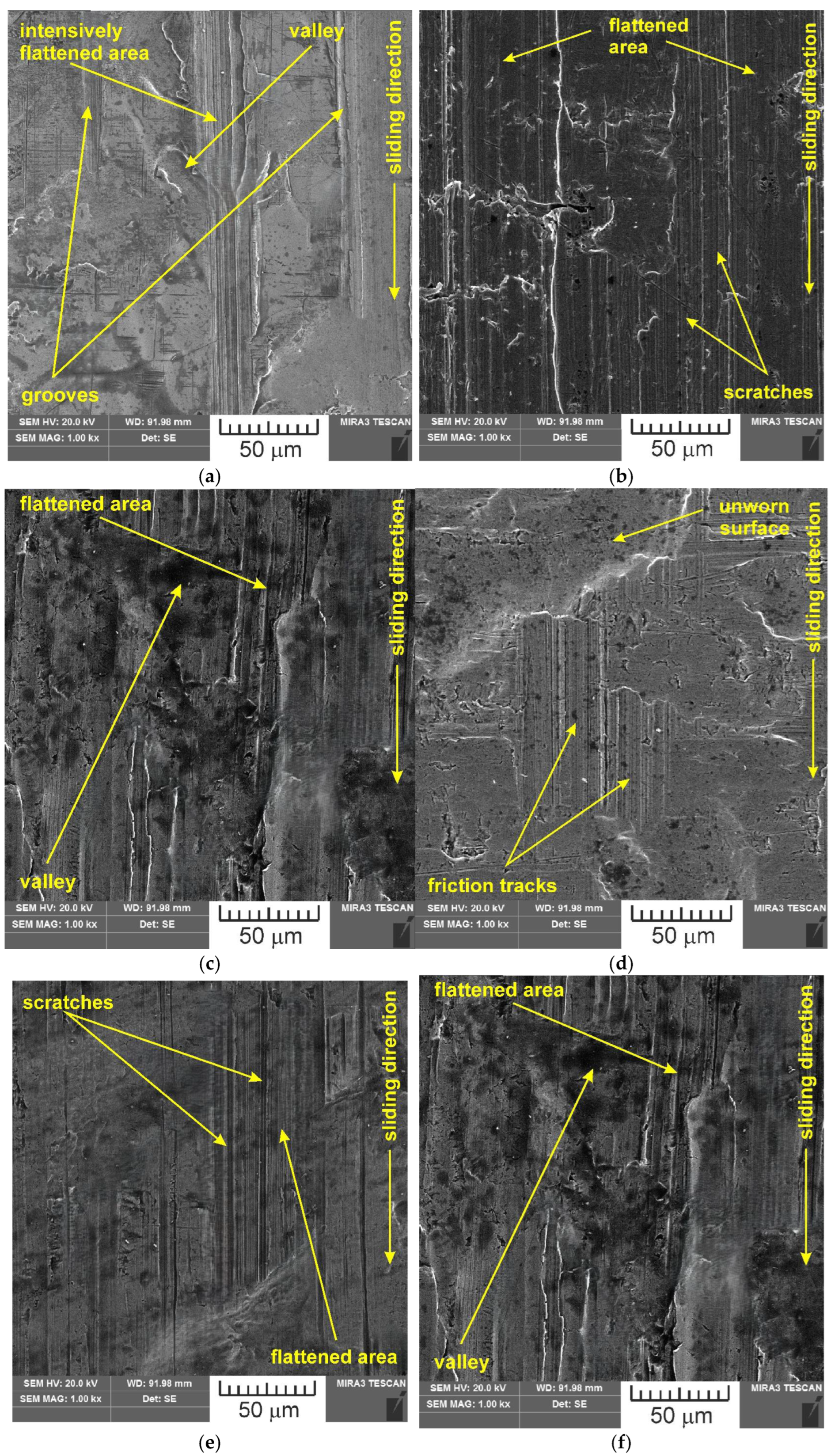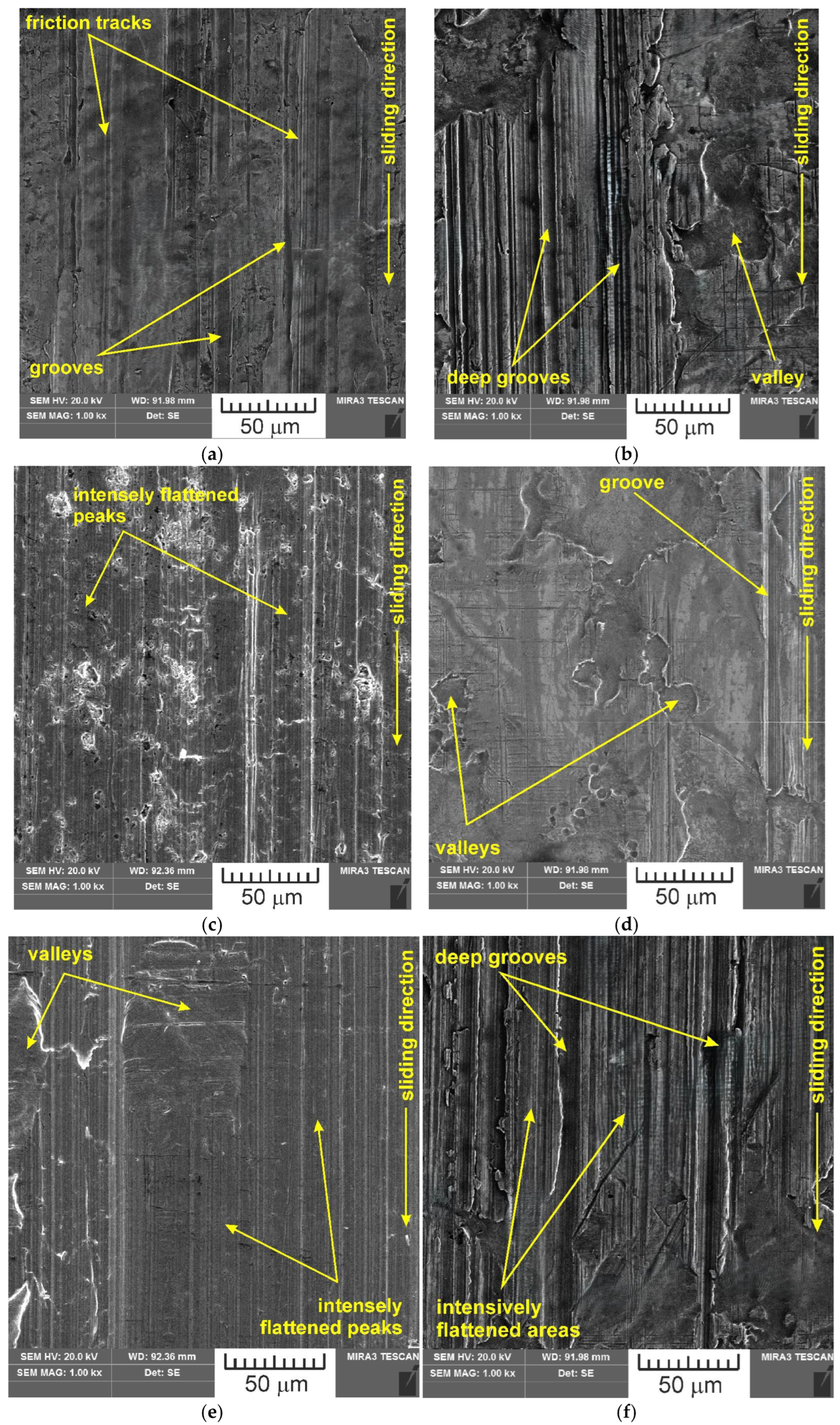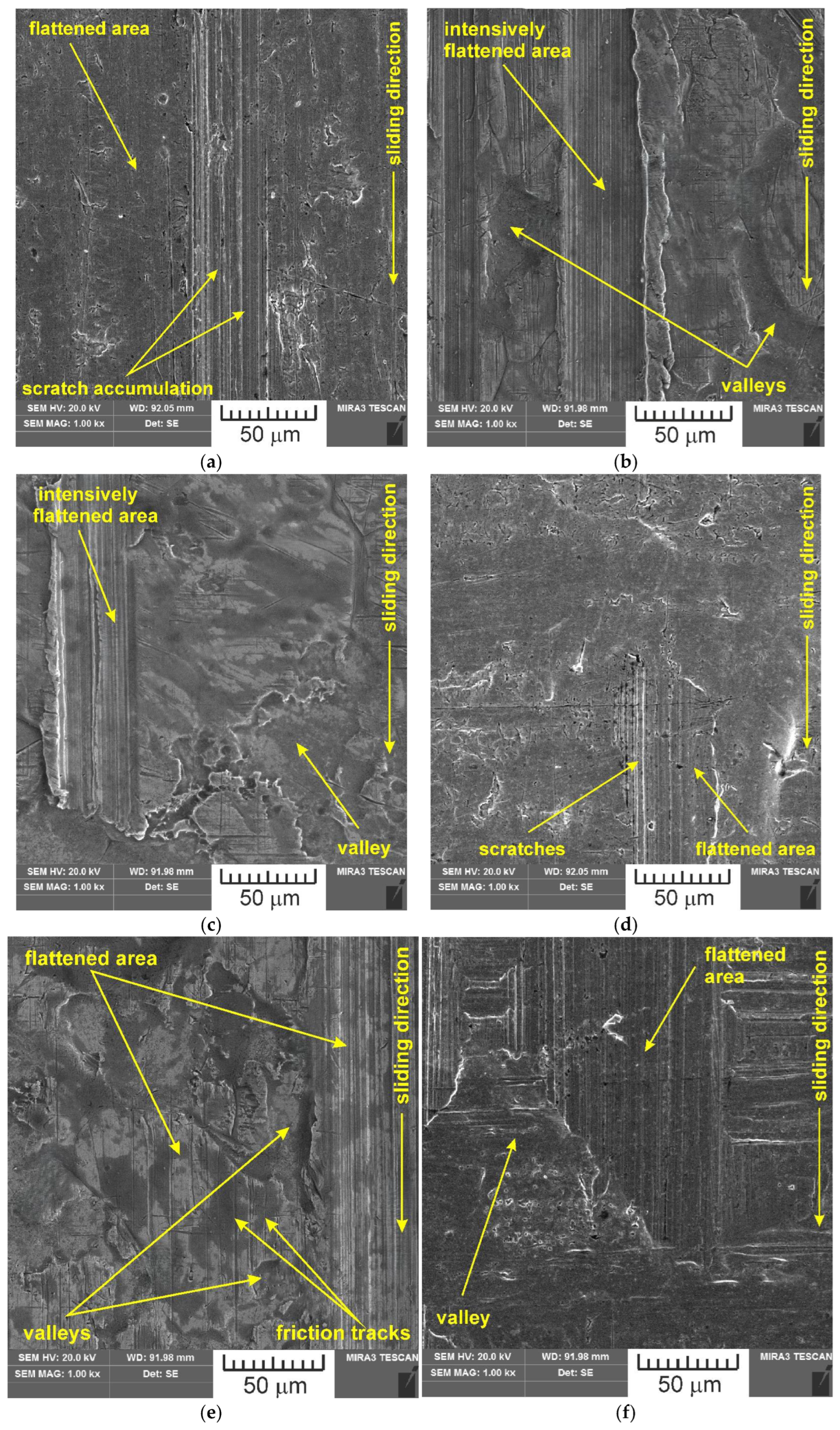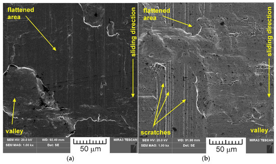 SEM images of the sample which was surface tested under dry friction conditions with EBM, UM and IPb countersamples are presented in Figure 18. Figure 19 presents SEM images of the sample surface tested under lubrication with base S100 Plus oil with the EBM, UM and IPb countersamples. SEM images of sample surfaces tested under lubrication with oil containing SiO2 and MoS2 particles are presented in Figure 20, Figure 21, Figure 22 and Figure 23. In general, the sheet metal surface contains valleys created by the sheet metal manufacturing process and subject to deformation-induced evolution, as well as areas with flattened asperities. Scratches can be observed at the highest asperities, resulting from the interaction of tool asperities and sheet asperities. Deep grooves are the result of ploughing friction, which is defined as the contribution to friction force that occurs when a hard asperity in the countersample penetrates a softer sheet of metal.