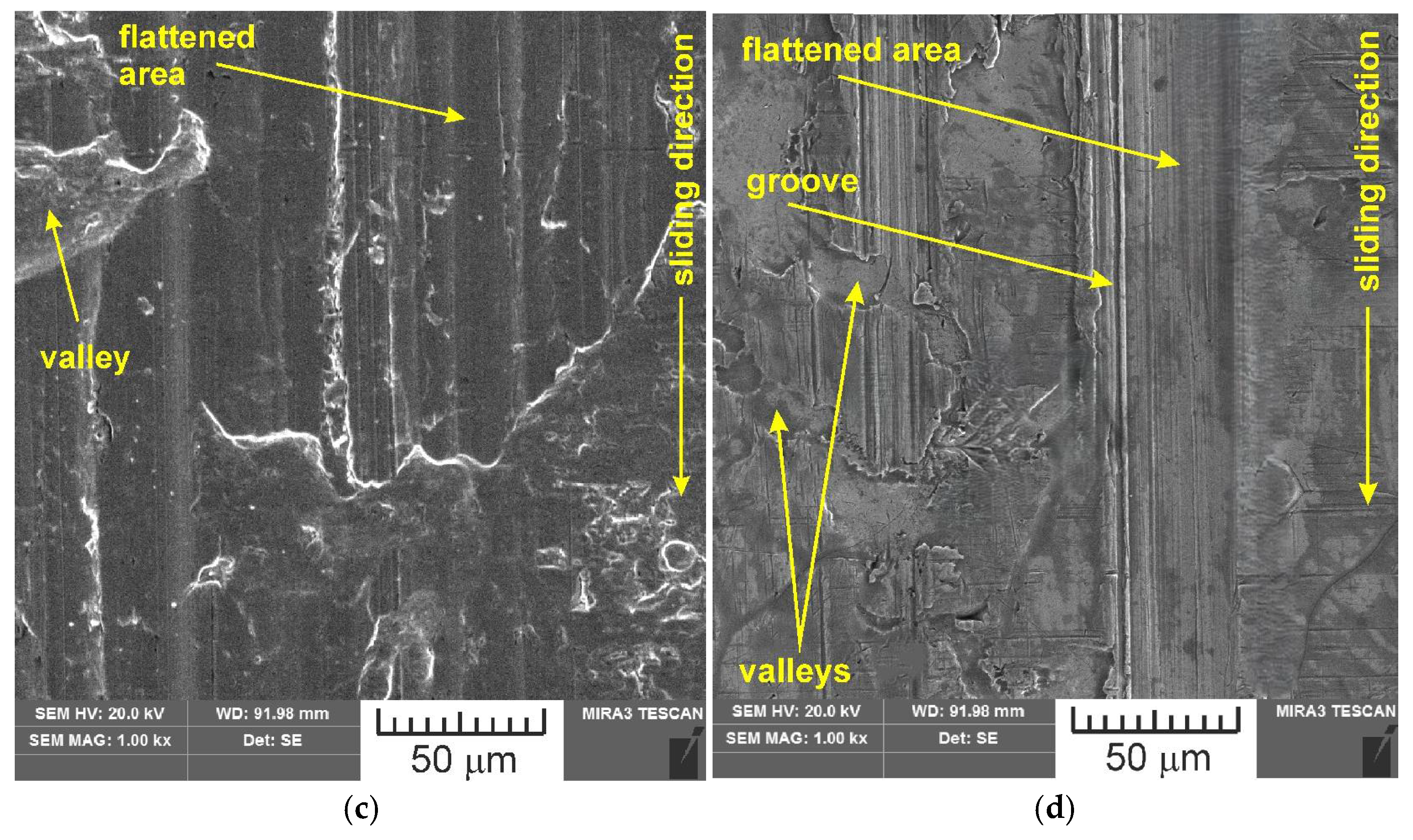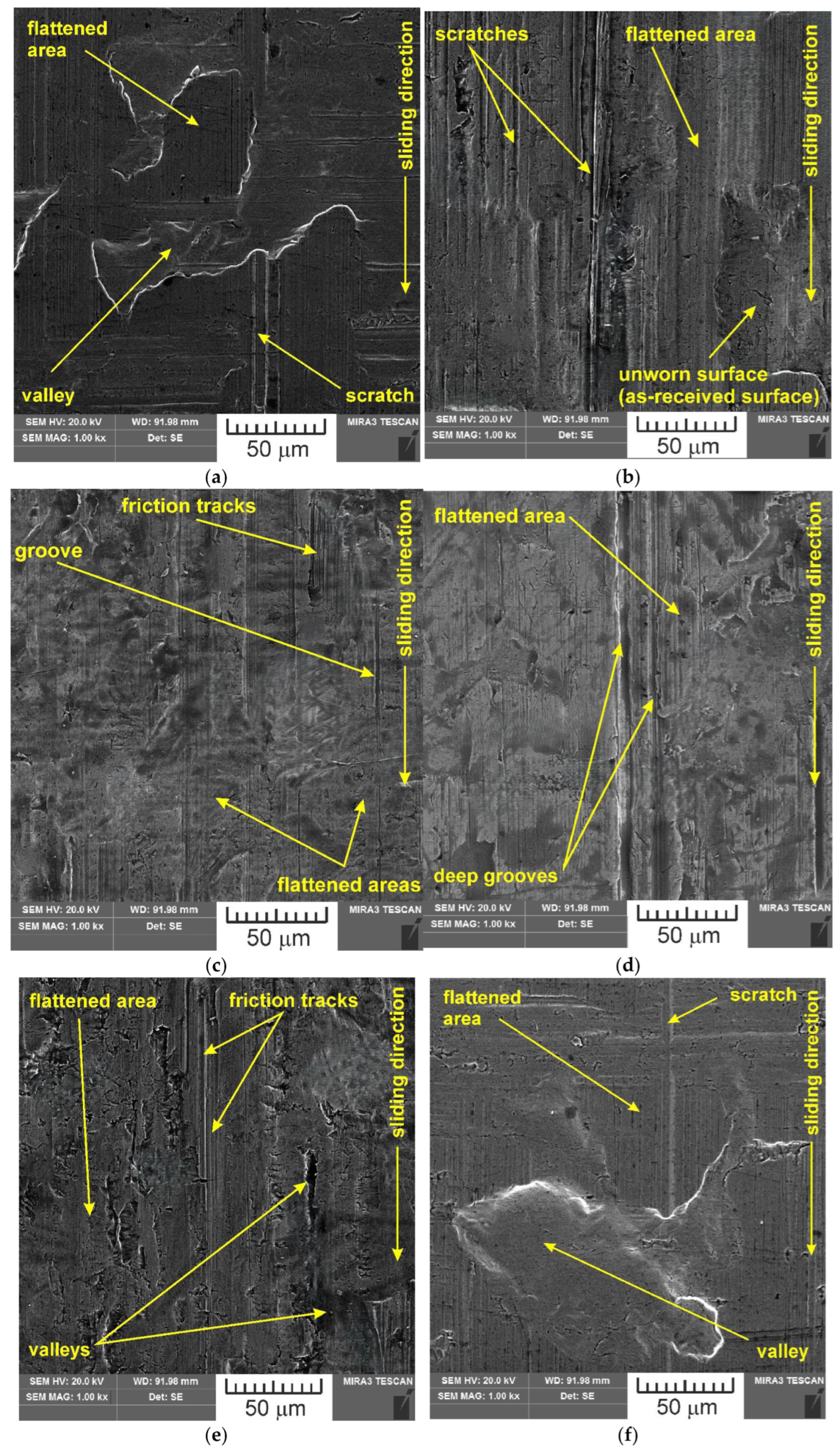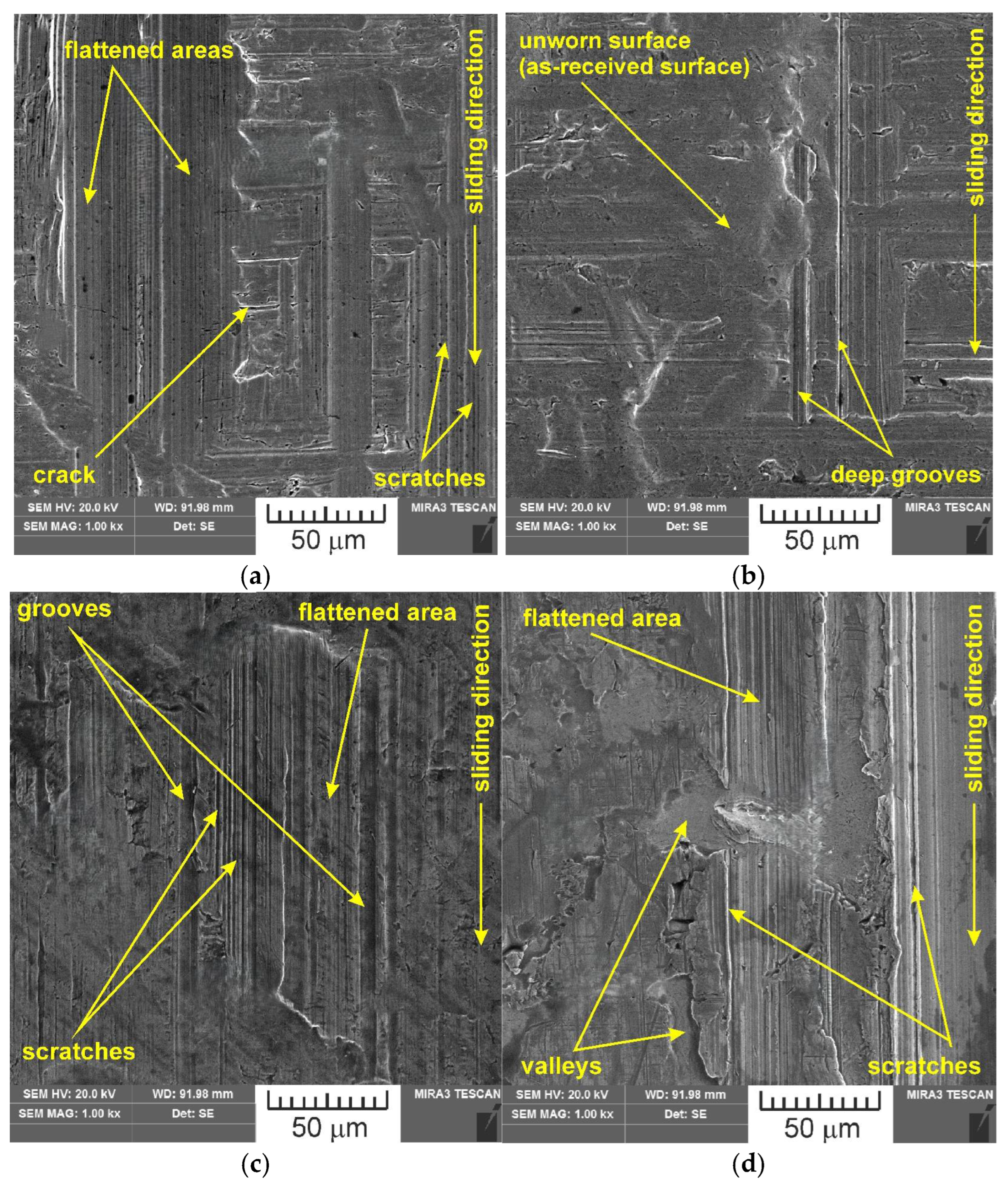 SEM images of the sample which was surface tested under dry friction conditions with EBM, UM and IPb countersamples are presented in Figure 18. Figure 19 presents SEM images of the sample surface tested under lubrication with base S100 Plus oil with the EBM, UM and IPb countersamples. SEM images of sample surfaces tested under lubrication with oil containing SiO2 and MoS2 particles are presented in Figure 20, Figure 21, Figure 22 and Figure 23. In general, the sheet metal surface contains valleys created by the sheet metal manufacturing process and subject to deformation-induced evolution, as well as areas with flattened asperities. Scratches can be observed at the highest asperities, resulting from the interaction of tool asperities and sheet asperities. Deep grooves are the result of ploughing friction, which is defined as the contribution to friction force that occurs when a hard asperity in the countersample penetrates a softer sheet of metal.