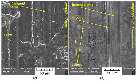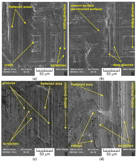 SEM images of the sample surface tested under dry friction conditions with the following countersamples: (a) EBM, (b) UM, (c) IPb + EBM and (d) IPb.