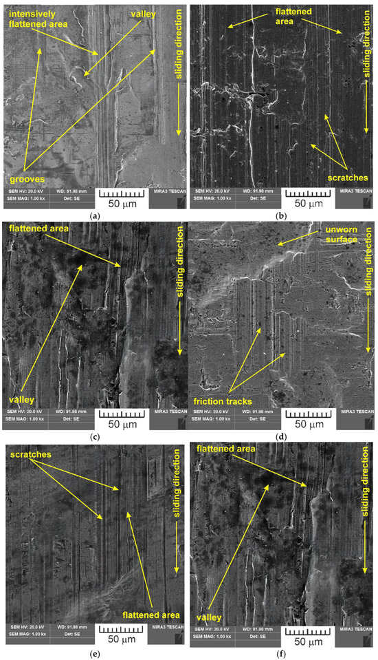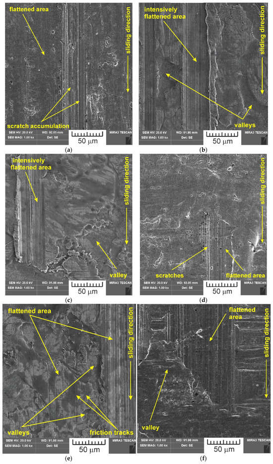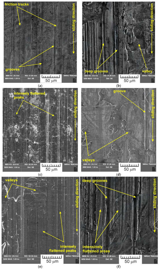 SEM images of the sample surface contacted with IPb + EBM countersample under lubrication with S100 Plus oil modified with (a) 1% SiO2, (b) 5% SiO2, (c) 10% SiO2, (d) 1% MoS2, (e) 5% MoS2, and (f) 10% MoS2.