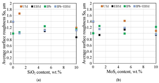 In the case of the IPb and EBM countersamples, the friction process resulted in a reduction in the average roughness value (Figure 25). Friction involving the unmodified countersamples was most sensitive to the SiO2 content (Figure 25a) and the addition of MoS2 (Figure 25b). In the absence of particles (or just a small amount: 1 wt.%), friction resulted in an increase in average roughness (Figure 25a). Under the conditions of lubrication with oil with the addition of 5–10 wt% SiO2 (Figure 25a), due to the frictional interaction of the strip sample with the countersamples, the average roughness Sa decreased, compared to the as-received surface.