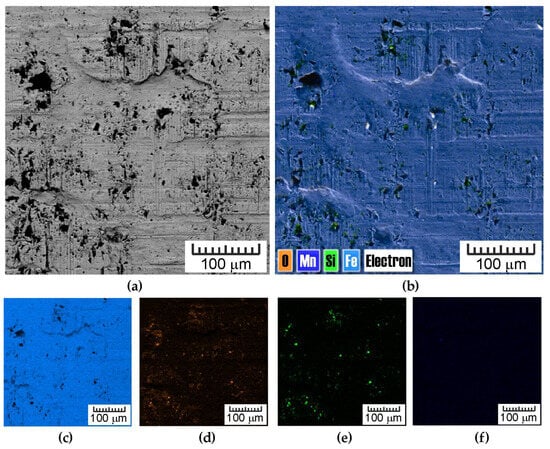 (a) SEM image (back-scattered electron detector mode) of strip sample after BUT test with oil containing SiO2 particles, (b) energy dispersive spectroscopy (EDS) layered image and EDS maps of the (c) Fe, (d) O, (e) Si and (f) Mn distribution.