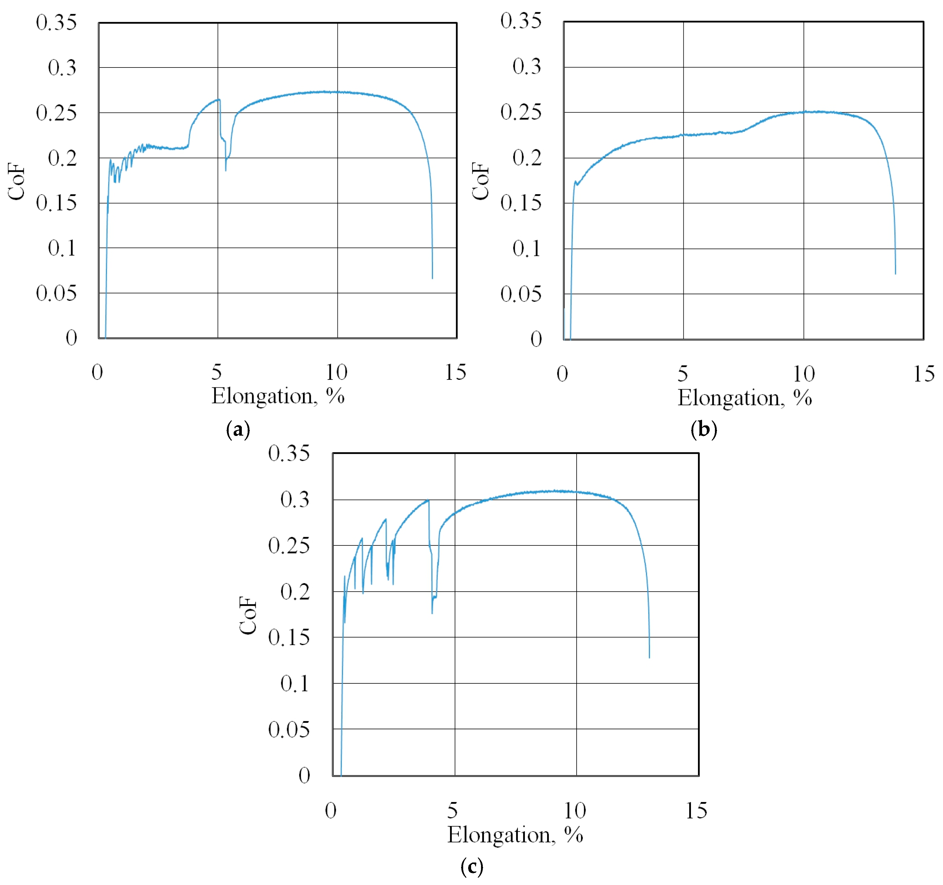 Figure 8. Changes in CoF (blue lines) during BUT test under dry friction conditions with the following countersamples: (a) UM, (b) IPb + EBM and (c) IPb.