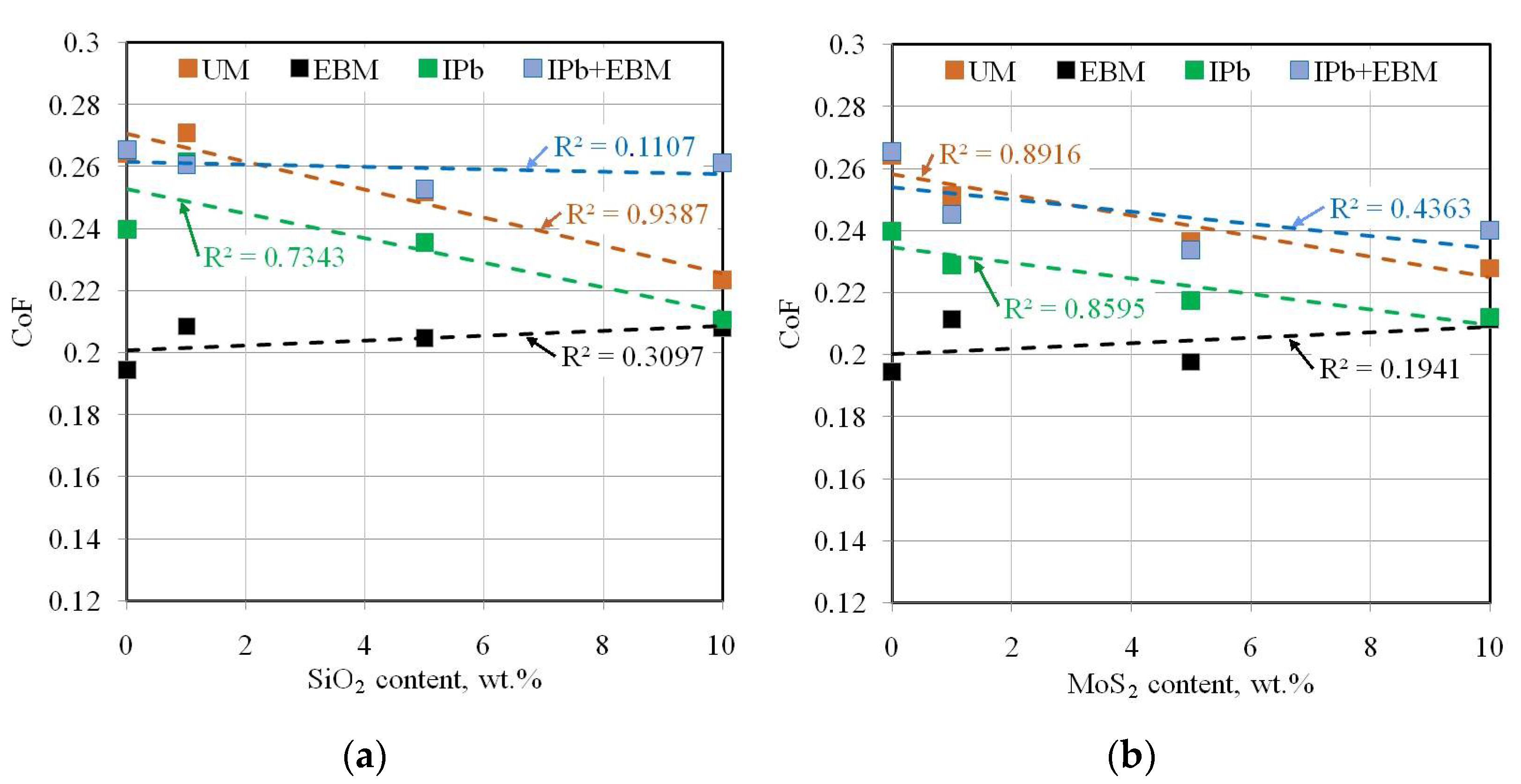 Figure 15. Effect of the addition of (a) SiO2 and (b) MoS2 to S100 Plus oil on the CoF.