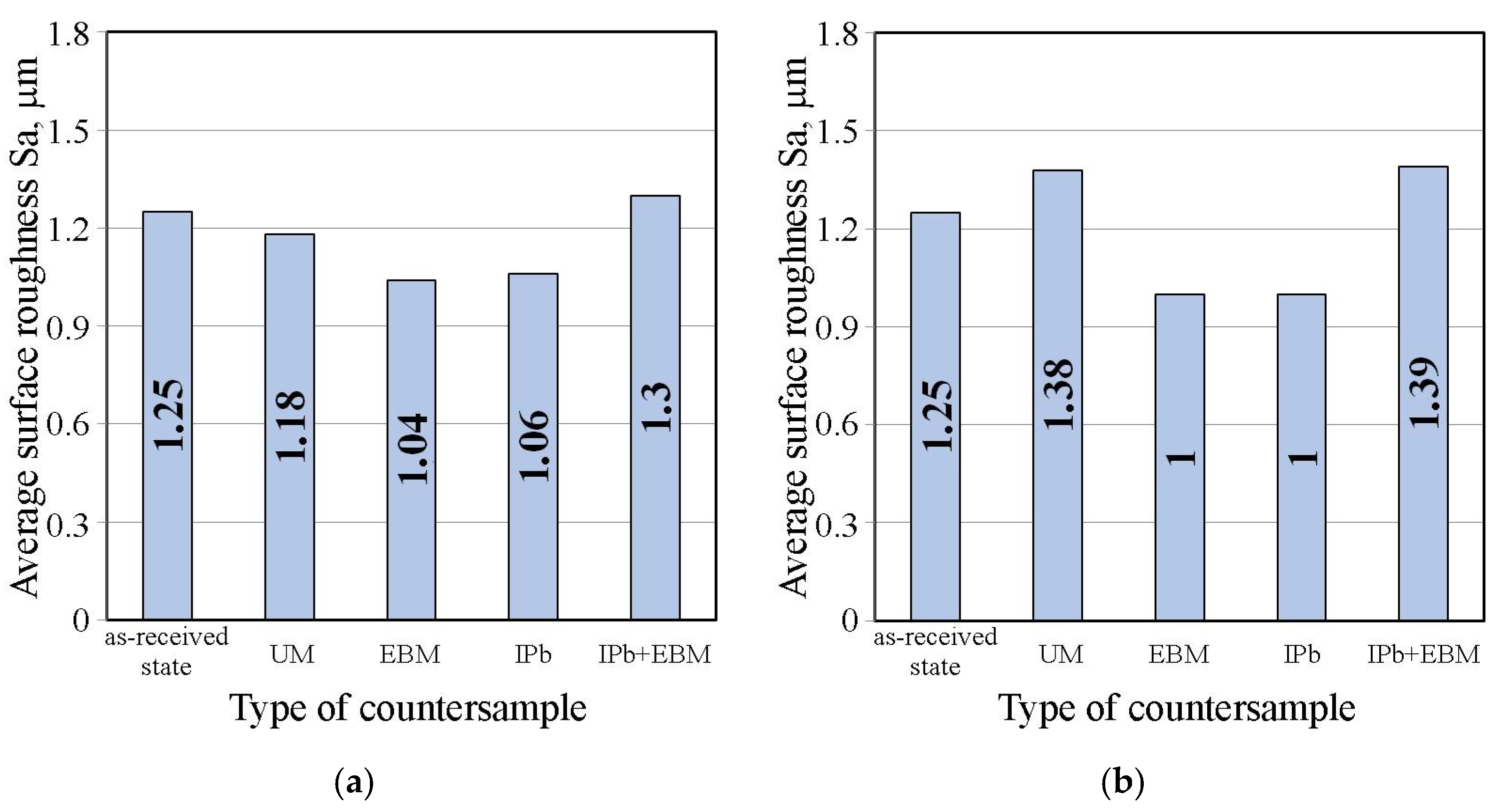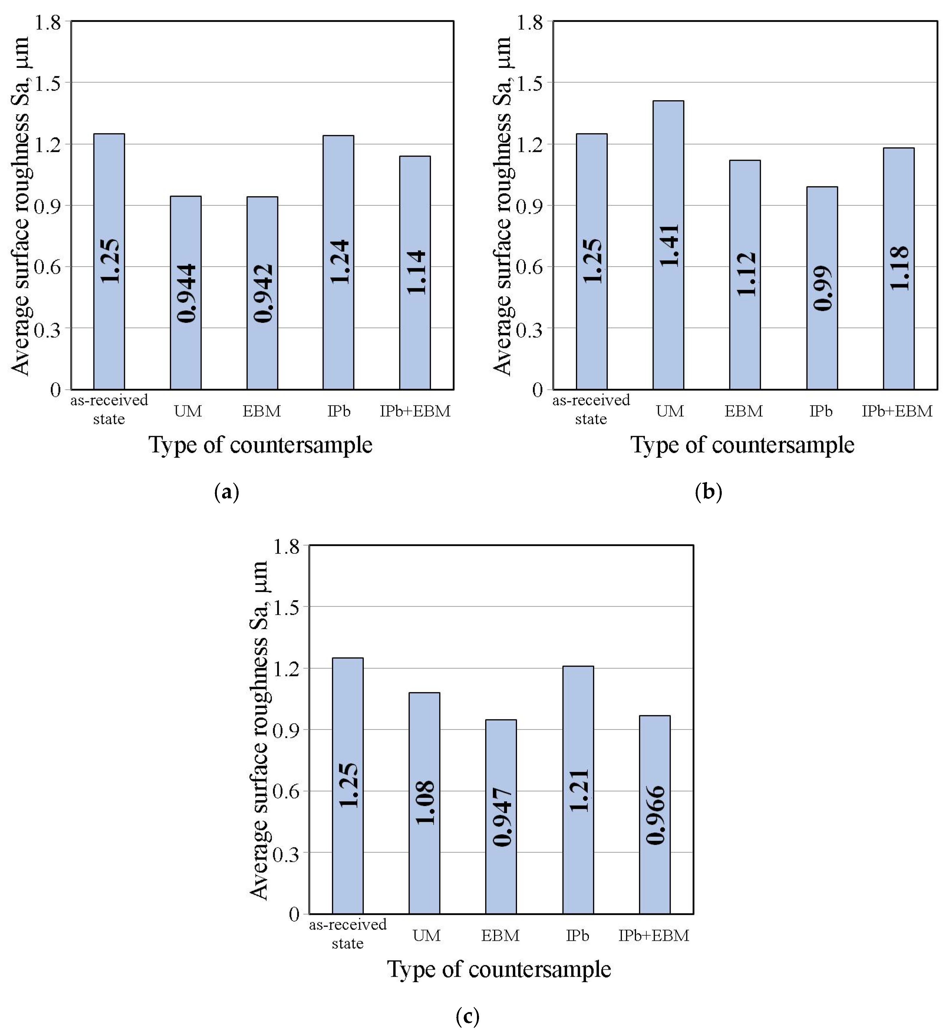 As part of the investigations, three different variants of countersample surface modification were considered. The friction test results obtained for the modified countersamples were compared with the results of the tests conducted using unmodified (UM) countersamples. The countersample surface modification was performed using three methods: electron beam melting (sample denotation—EBM), ion implantation of lead (sample denotation—IPb) and combined ion implantation of Pb and EBM (sample denotation—IPb + EBM). A detailed description of the countersample surface modification procedures was already provided in a recent article [33].