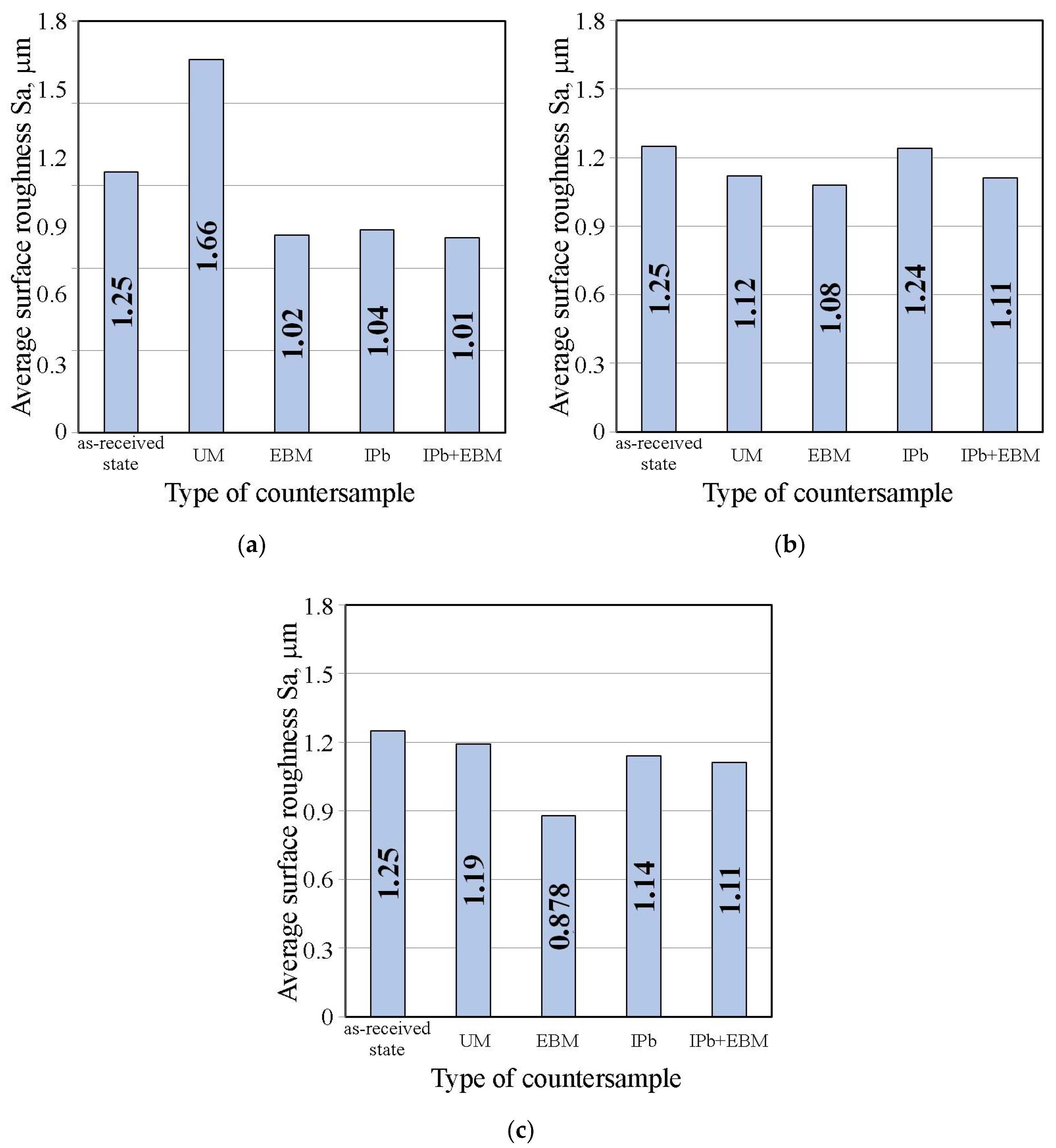 Figure 17 shows the effect of countersample surface treatment on average surface roughness of strip samples tested with S100 Plus oil with an SiO2 additive. In the case of oil with 1 wt.% SiO2, all countersamples with a modified surface provided a reduction in average surface roughness compared to the UM countersample. The largest increase in the Sa parameter under friction conditions with SiO2-modified oil was observed for the unmodified countersample (Sa = 1.66 μm). In friction conditions with oil containing 5 wt.% SiO2 (Figure 17b), a reduction in the Sa parameter value in EBM countersample was observed for all countersamples (up to 13.6%). Similarly, during friction with oil containing 10 wt.% SiO2, the friction process caused a reduction in average roughness between 4.8% (UM countersample) and 29.8% (EBM countersample).