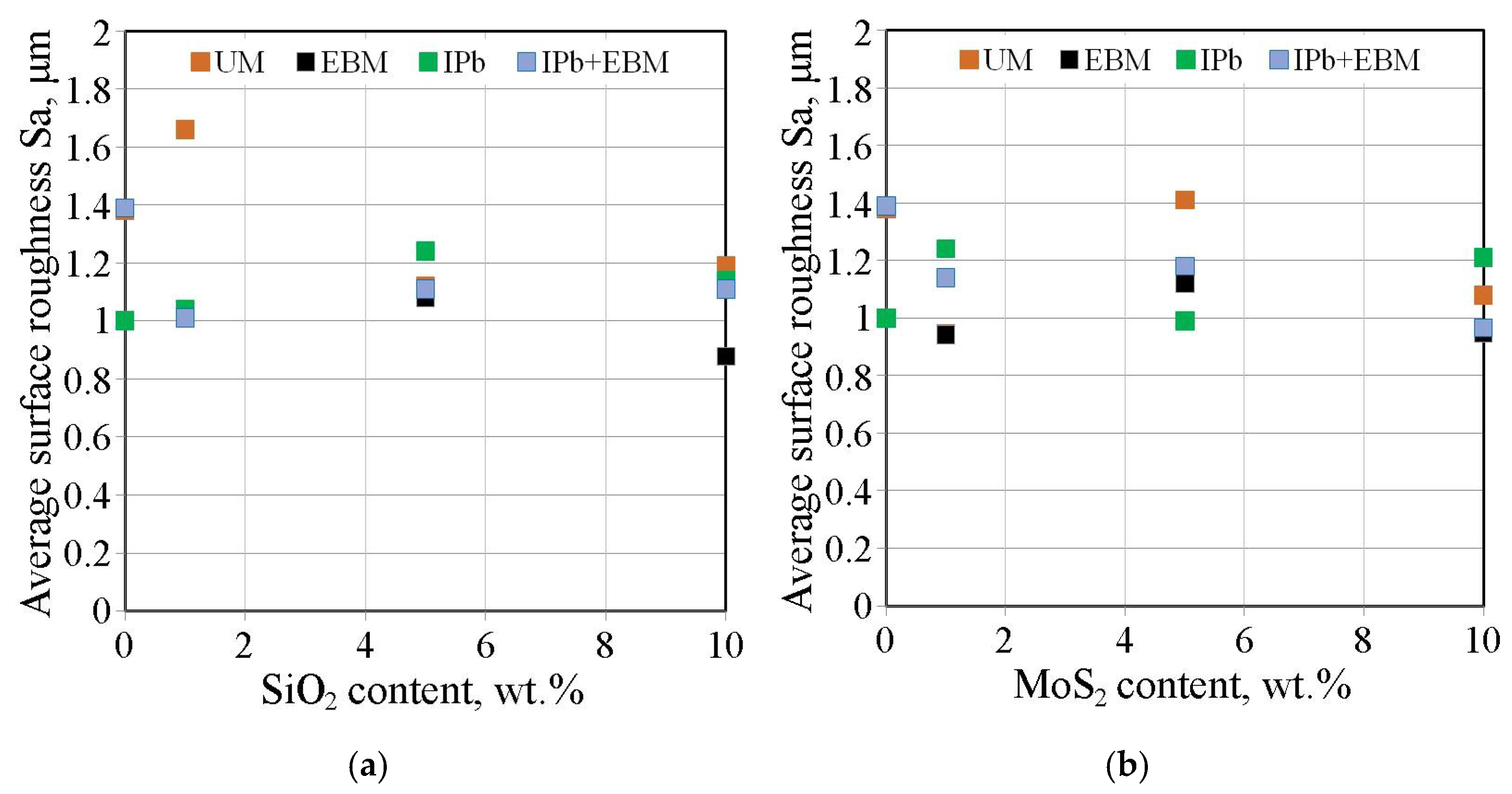 Figure 25. Influence of (a) SiO2 and (b) MoS2 content in S100 Plus oil on the average roughness Sa of strip samples after friction tests.