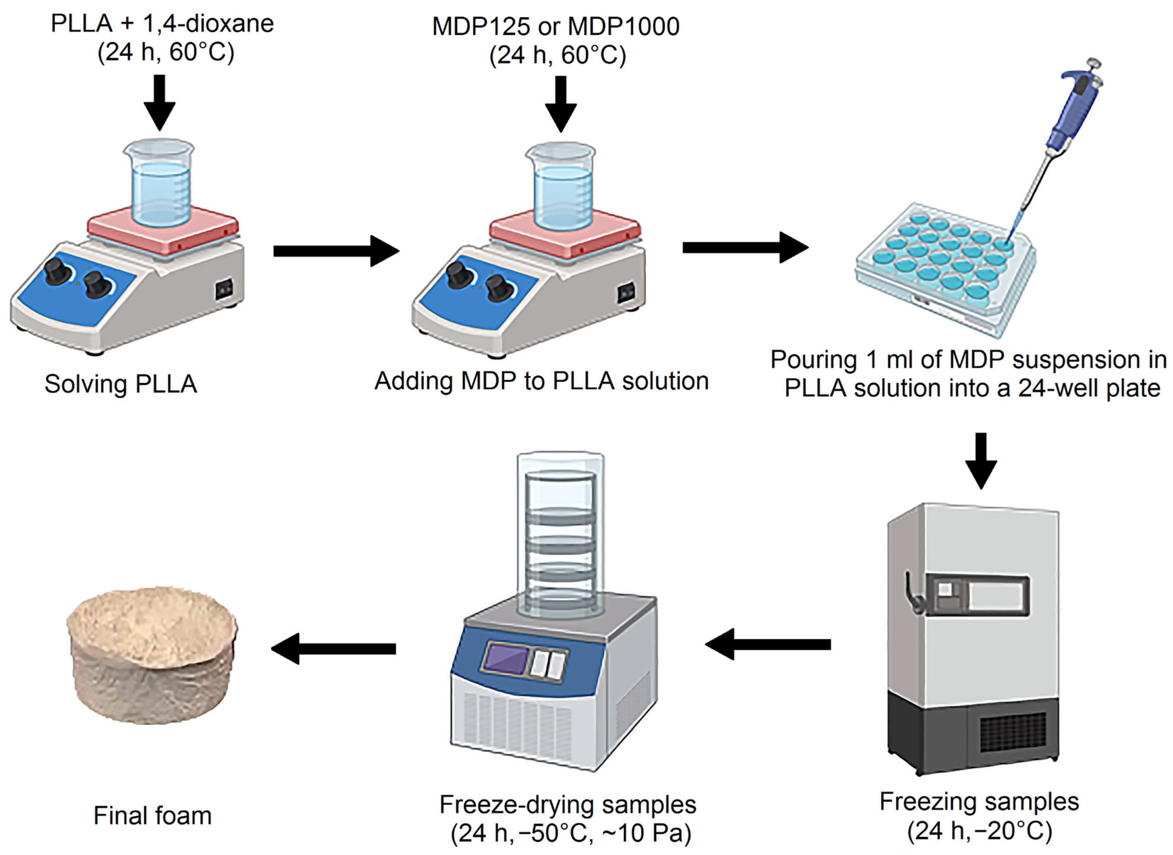 After that, the suspension of diamond powder in PLLA/1,4-dioxane solutions were introduced into the 24-well plate (1 mL to one well). Samples were frozen for 24 h prior to lyophilization. Then, the samples were moved to a freeze dryer (Labconco 2.5, Kansas City, USA) for 24 h, at a temperature of −50 °C and a pressure of ~20 Pa. This process yielded foam composites with varying MDP loadings. The reference sample was prepared without MPD addition (see Figure 1).