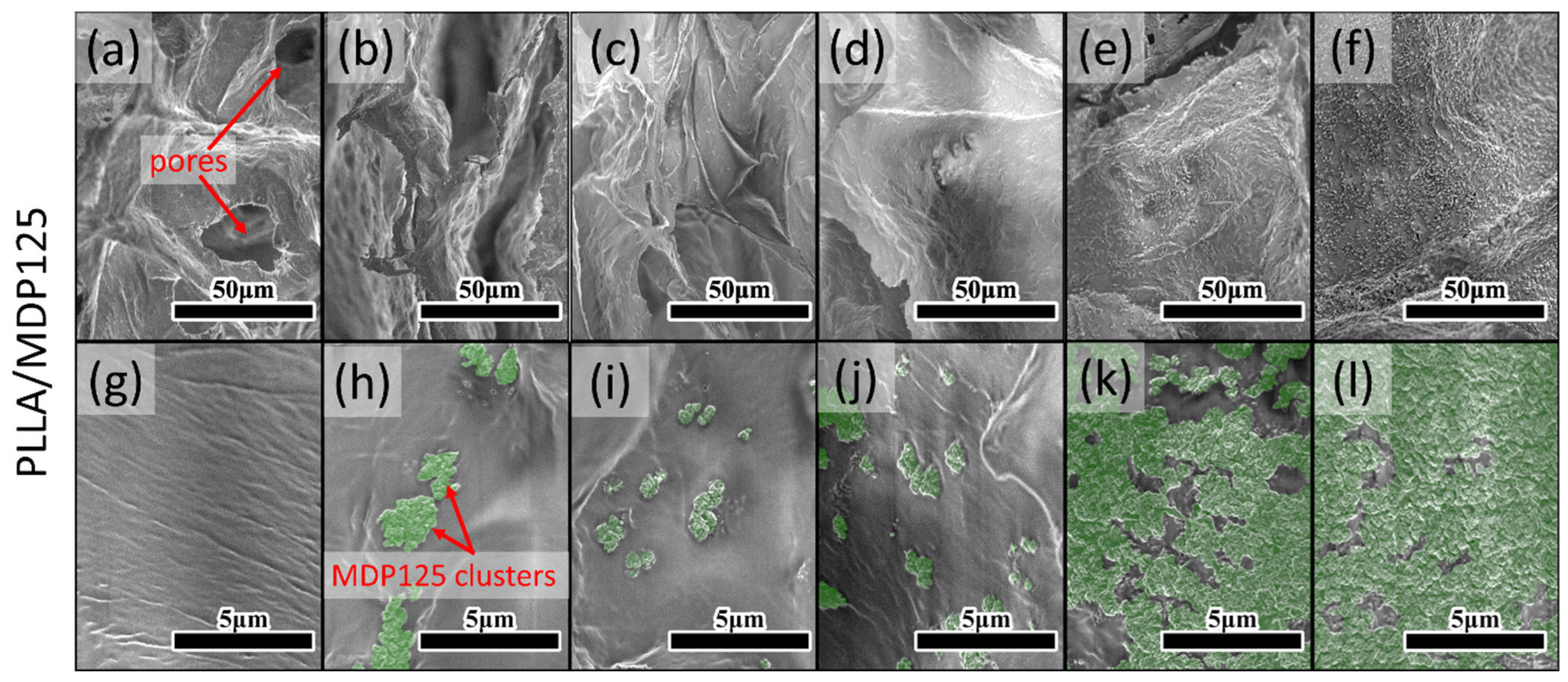 Figure 2. SEM images of cross-sections for samples with MDP125 powder. Images (af) present a general overview. Images (gl) present higher magnification with clearly visible, highlighted diamond nanoparticles. The ratio of diamond particles to PLA increases from left to right: (a,g) PLLA, (b,h) PLLA/MDP125-5, (c,i) PLLA/MDP125-10, (d,j) PLLA/MDP125-15, (e,k) PLLA/MDP125-50, (f,l) PLLA/MDP125-75.