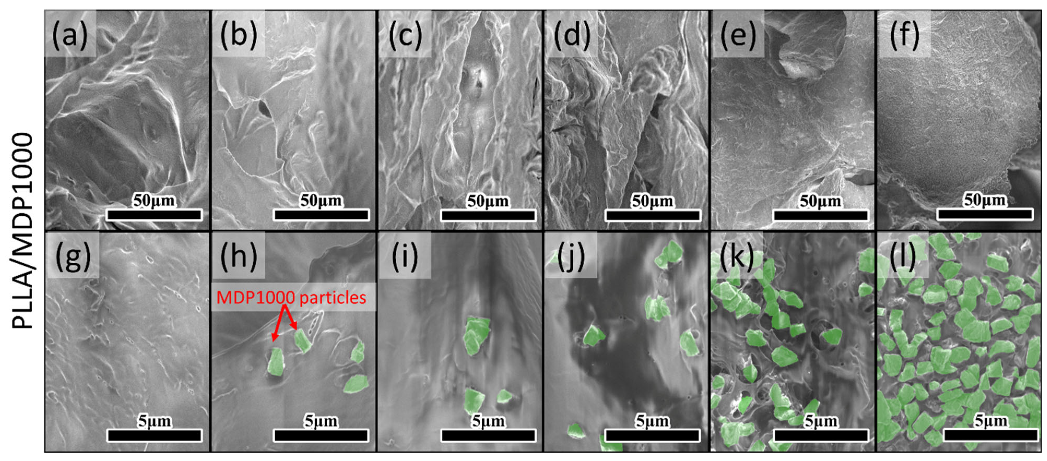 Figure 3. SEM images of cross-sections for samples with MDP1000 powder. Images (af) present a general overview. Images (gl) present higher magnification with clearly visible, highlighted diamond nanoparticles. The ratio of diamond particles to PLA increase from left to right: (a,g) PLLA, (b,h) PLLA/MDP1000-5, (c,i) PLLA/MDP1000-10, (d,j) PLLA/MDP1000-15, (e,k) PLLA/MDP1000-50, (f,l) PLLA/MDP1000-75.