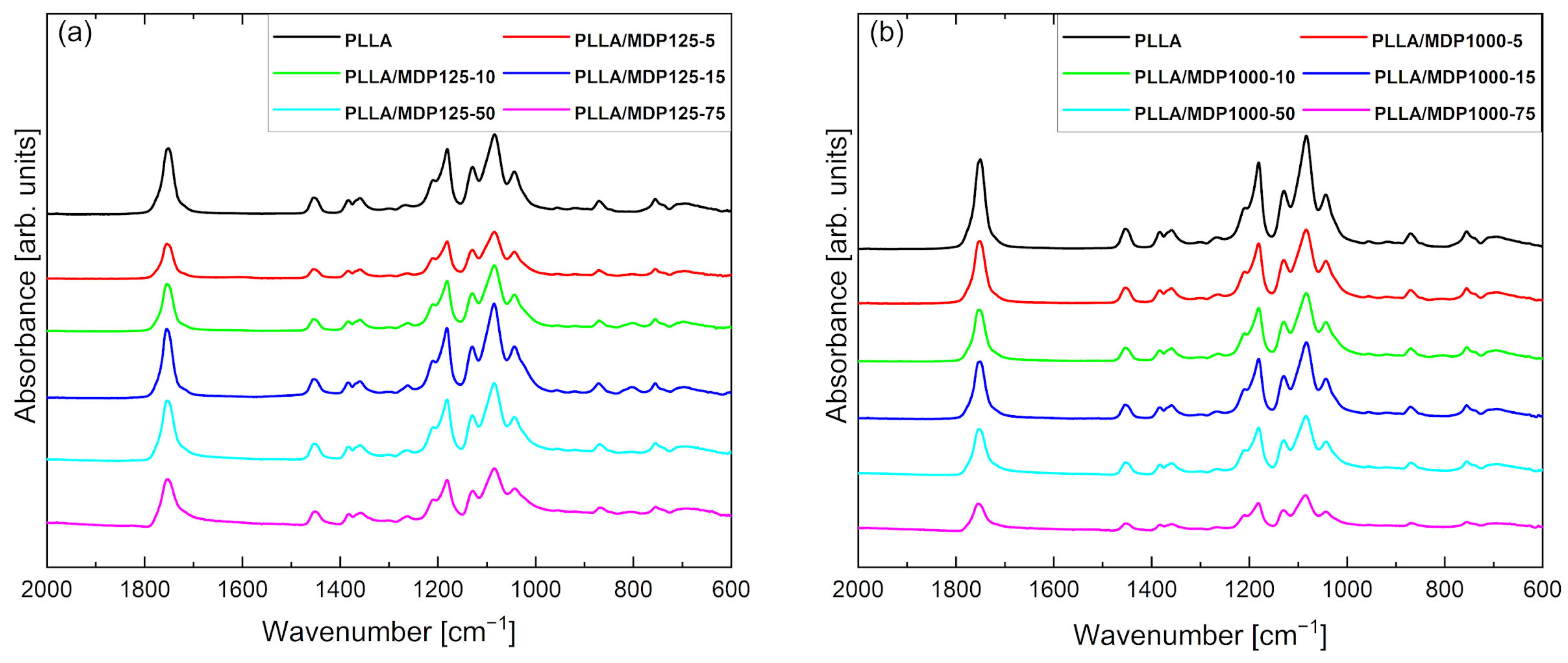 Figure 5. FTIR/ATR spectra of PLLA doped with (a) MDP125 and (b) MDP1000 samples. Lack of presence of new peaks indicates that no chemical interaction between polymer matrix and MDP occurs.