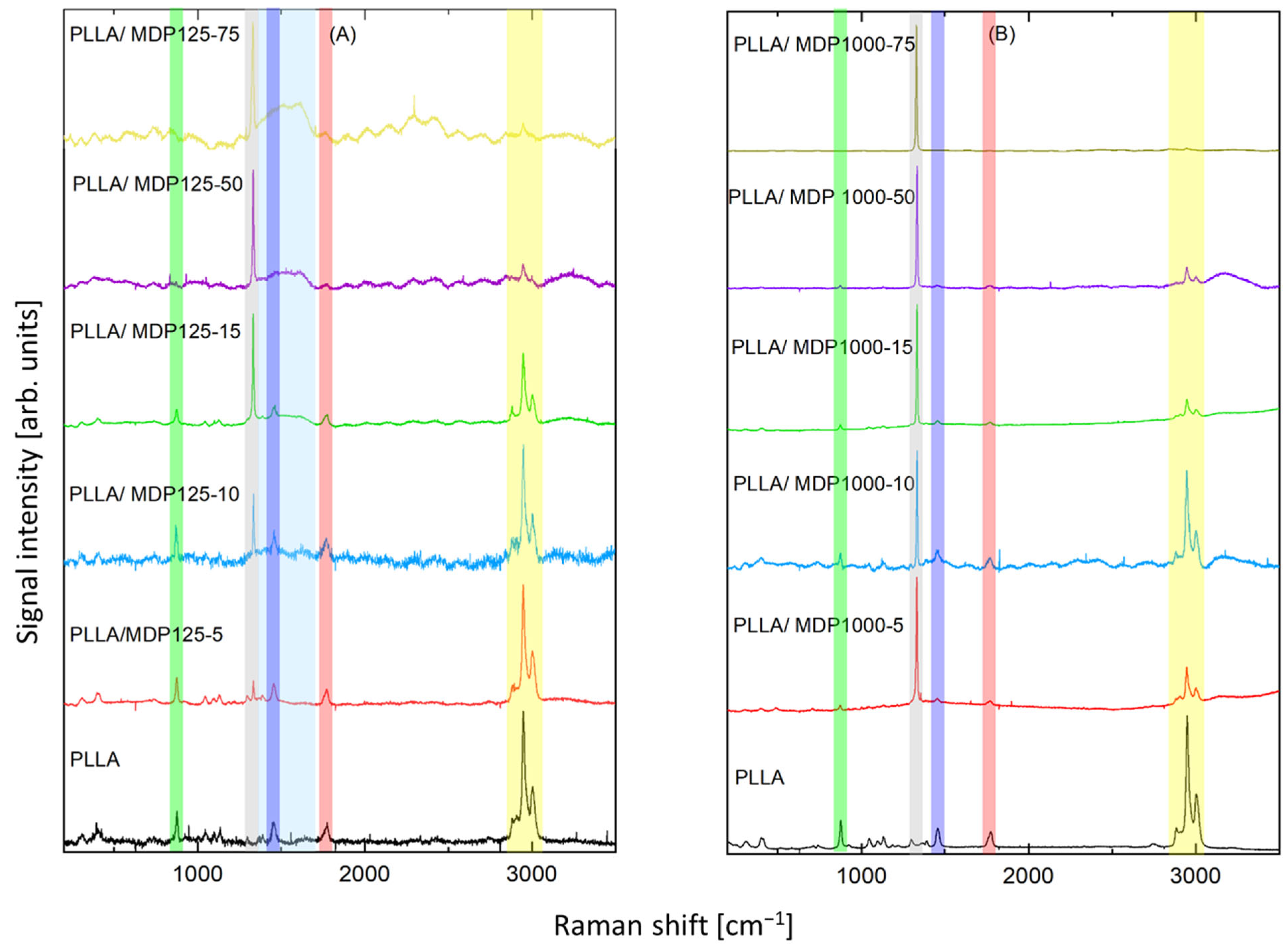 Figure 6. Raman spectra of two reference samples (neat PLLA) and all diamond contents of (A) MDP125 and (B) MDP1000 in PLLA. The colored rectangles, as described in the main text, mark the main Raman bands. (Attn. green: ν(C–COO) stretching mode, grey: diamond lattice oscillations, dark blue: δas(C–H) asymmetric bending deformation, light blue: D and G band of non-diamond carbon phase, red: ν(C=O) stretching vibration, yellow: ν(C-H) stretching vibrations).