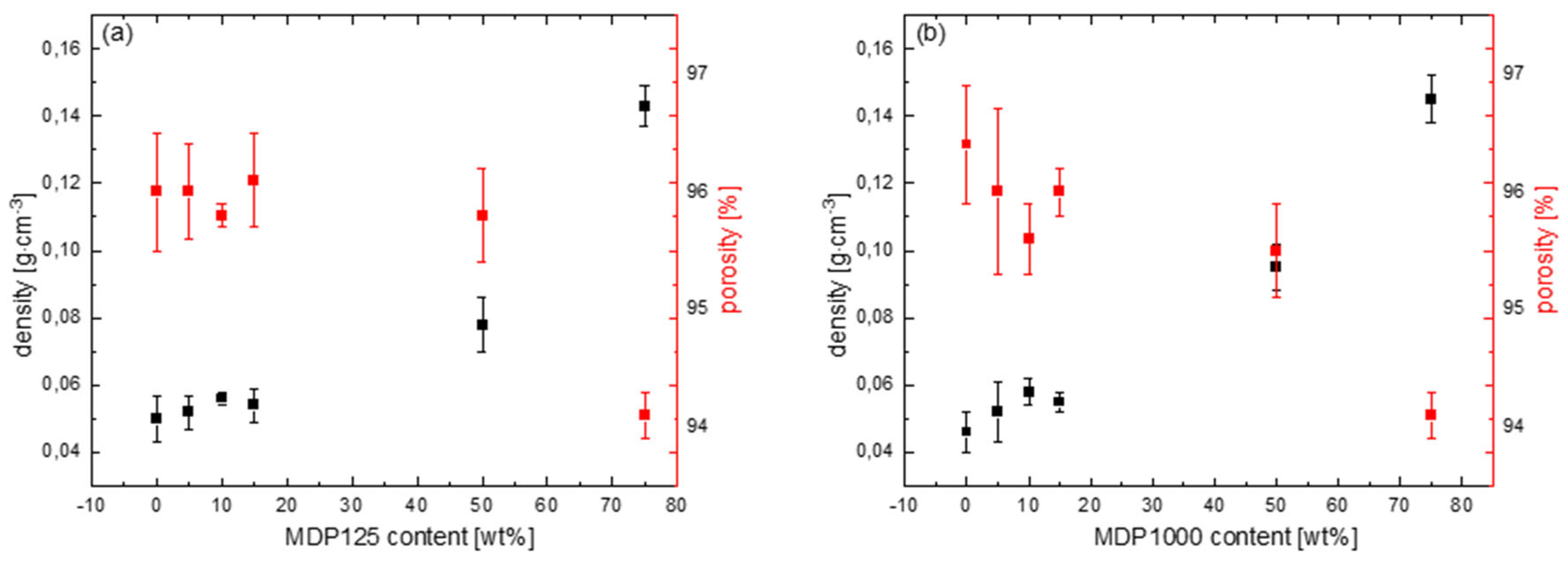 For both diamonds sizes, the trends are identical—an increase in the diamond content of the system results in an increase in density and a decrease in porosity. The addition of MDP125, as well as MDP1000 at 5, 10, and 15 wt% levels, does not actually affect the density, or the porosity of the systems; the measured changes are all within the measurement errors. Visible changes can be observed at 50% addition, where for MDP125 the density is ~0.078 g·cm−3 at 95.8% porosity, and for MDP1000 the density is 0.095 g·cm−3 at 95.5% porosity. The largest changes were observed for systems containing 75% diamond, where the porosity for both MDP125 and MDP1000 is ~94% and the density is 0.143–0.145 g·cm−3.