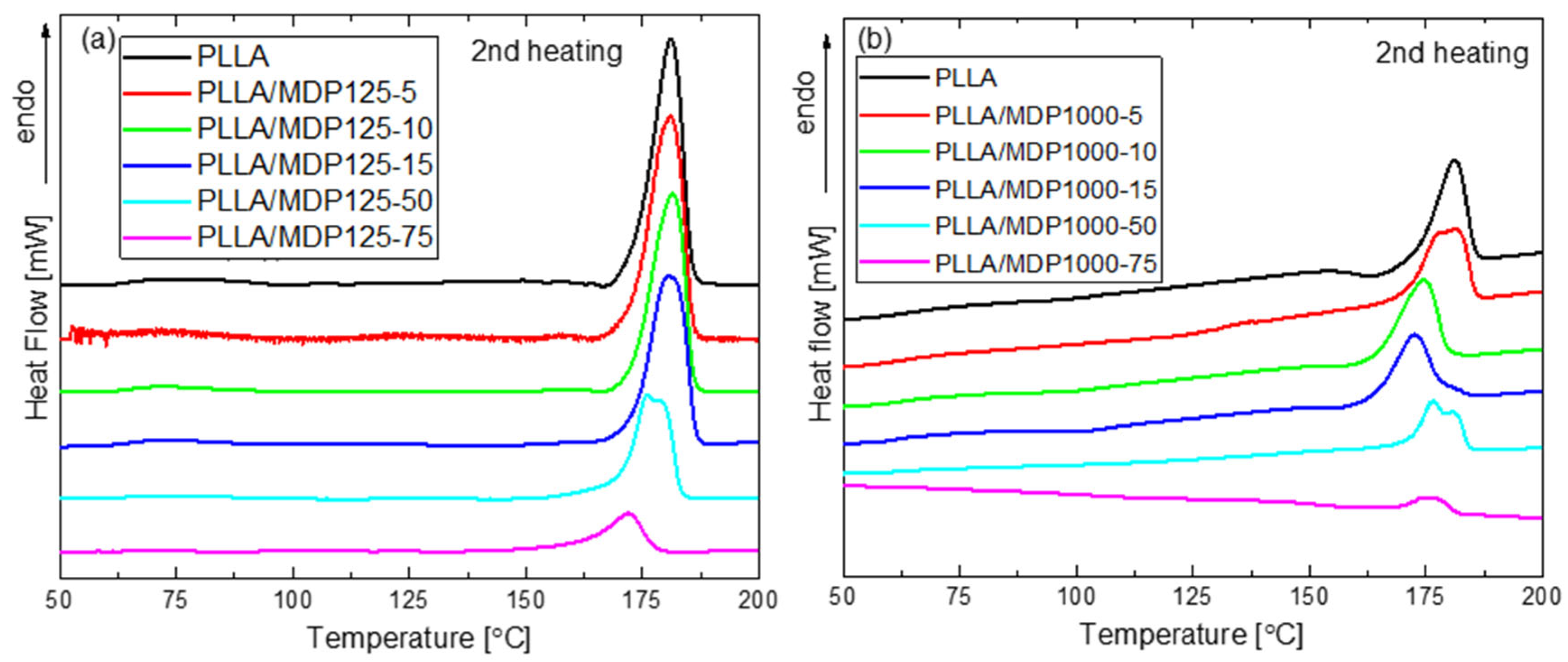 At the same time, for an increase in MDP125 content, the enthalpy of melting decreases and is ~46 J/g for PLLA, while for the system containing 75 wt% MDP125, the enthalpy value decreased to ~14.5 J/g. In addition, an exothermic effect was observed before the onset of melting for the curves measured for PLLA and systems with low MDP125 content. According to the literature, this is an α`- α transition. In addition, a split peak was observed for the PLLA/MDP125-50 composite, indicating the presence of crystallites with different melting points [26].
