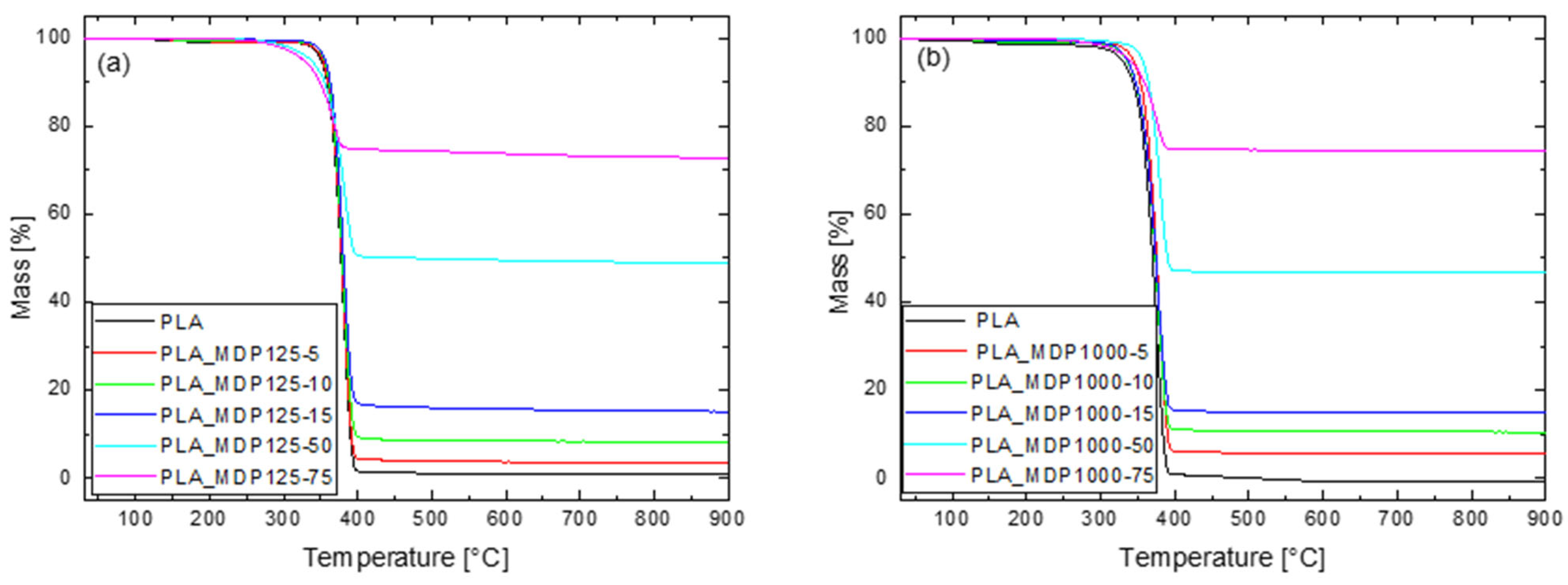 Figure 9 shows the TGA curves for the tested materials. Additionally, Tables S7 and S8 in the Supplementary Information present the TGA parameter values for PLLA samples with all MDP125 and MDP1000 contents, respectively. The results of the pyrolysis residue at 900 °C indicate that the residue values are close to the diamond content of the system. For example, for a system consisting only of PLLA, the mass loss at 900 °C is close to 100%, while for systems containing 75% diamond additives, the loss at 900 °C is close to 25%, which is the PLLA content of the system. In addition, for both MDP125 and MDP1000, the curves at analogous diamond content are close to each other, indicating that the behavior of the two types of additives is similar, and that the actual content of the additives in the system is very close to the theoretical assumptions.