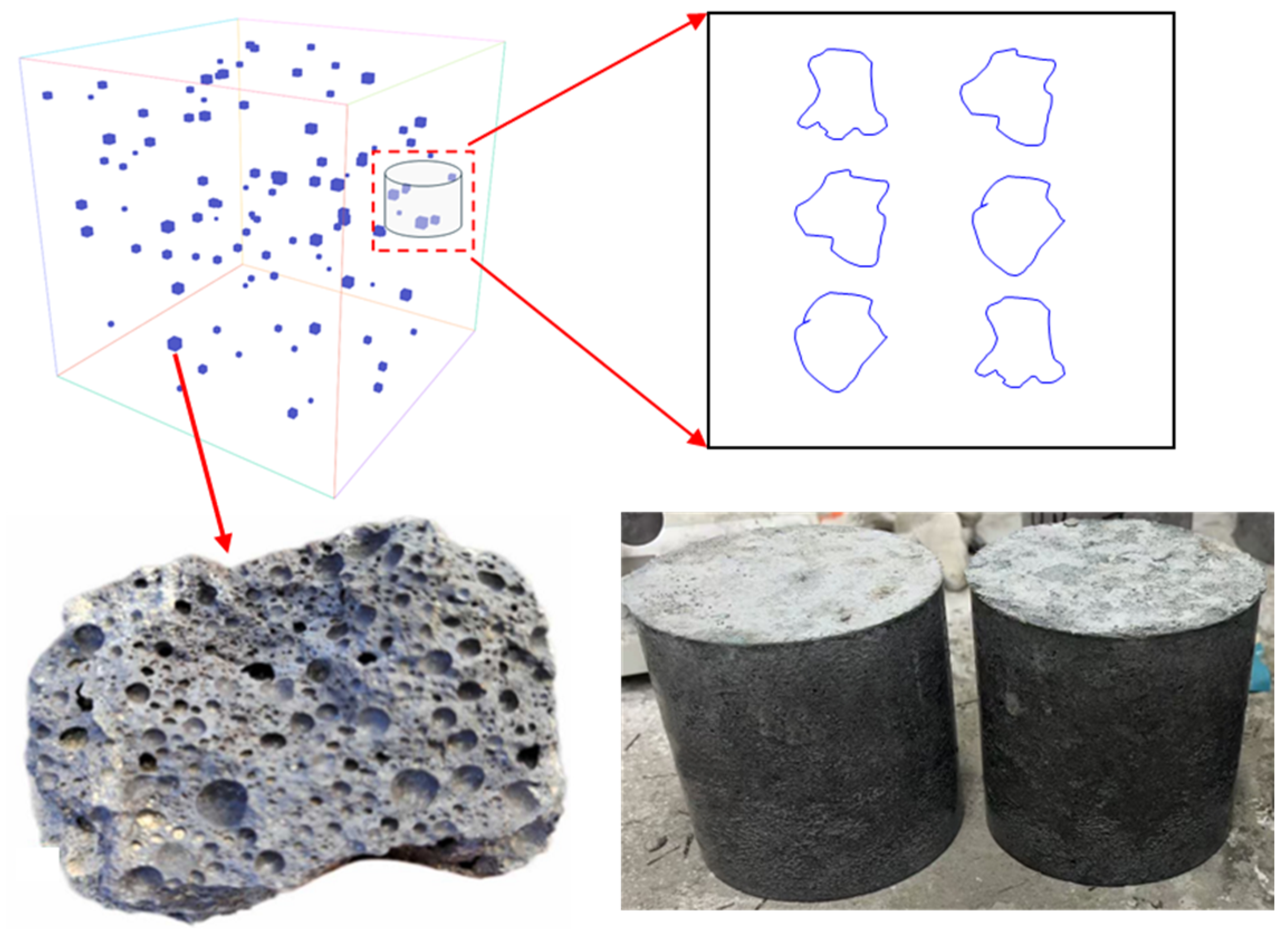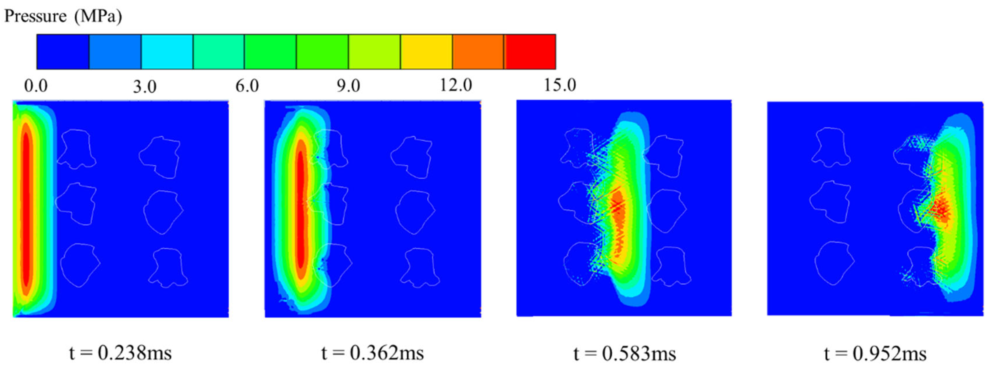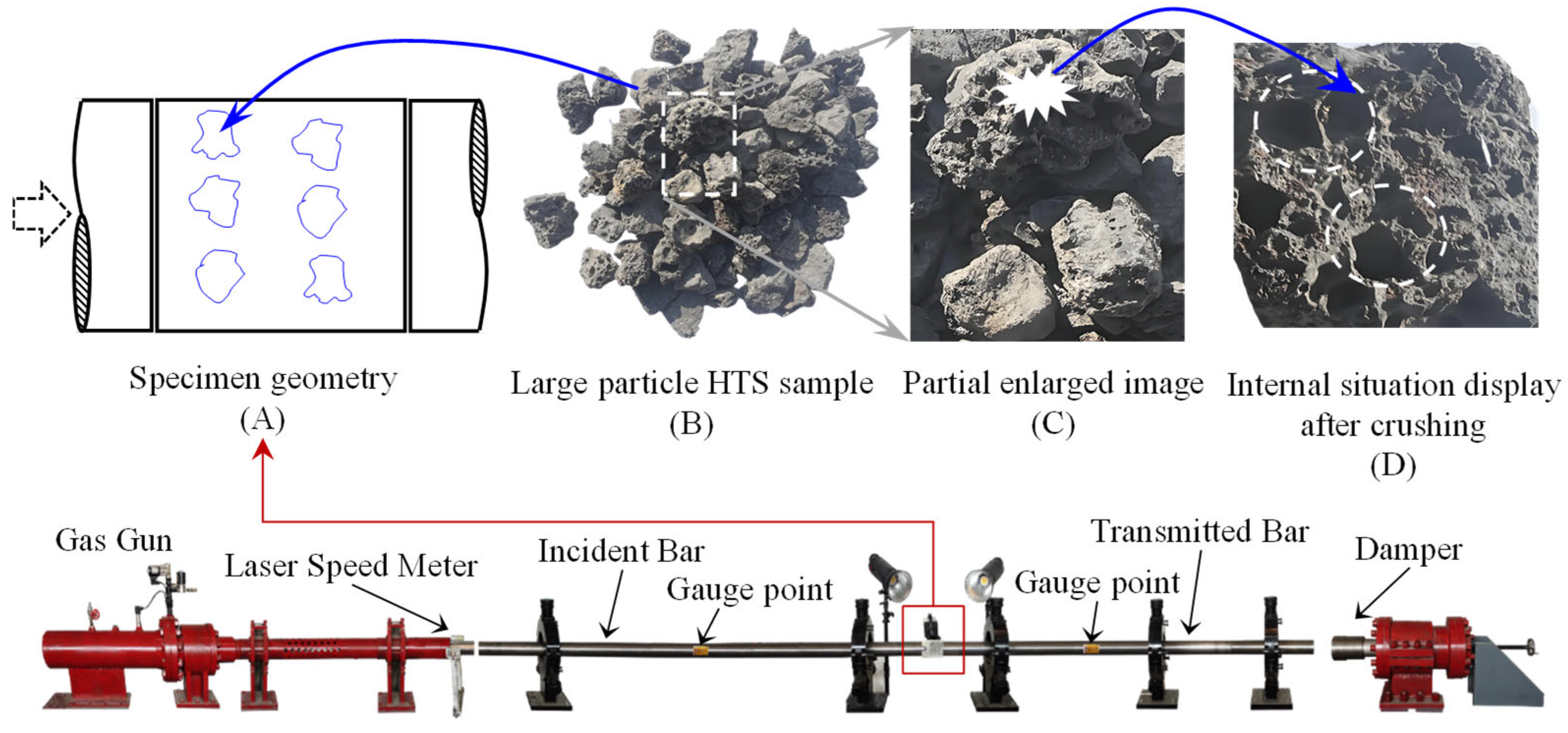- CT and SEM confirm 1–3 mm intra-HTS pores and a dense interfacial transition zone (ITZ). Numerical results further show that after traversing two bands of HTS particles, the stress-wave peak decreases from 15 MPa to 6 MPa, while the pulse width broadens from 0.15 ms to 0.22 ms—indicating that reflections at solid–gas interfaces and multiple scattering in HTS drive amplitude attenuation and, consequently, energy dispersion.