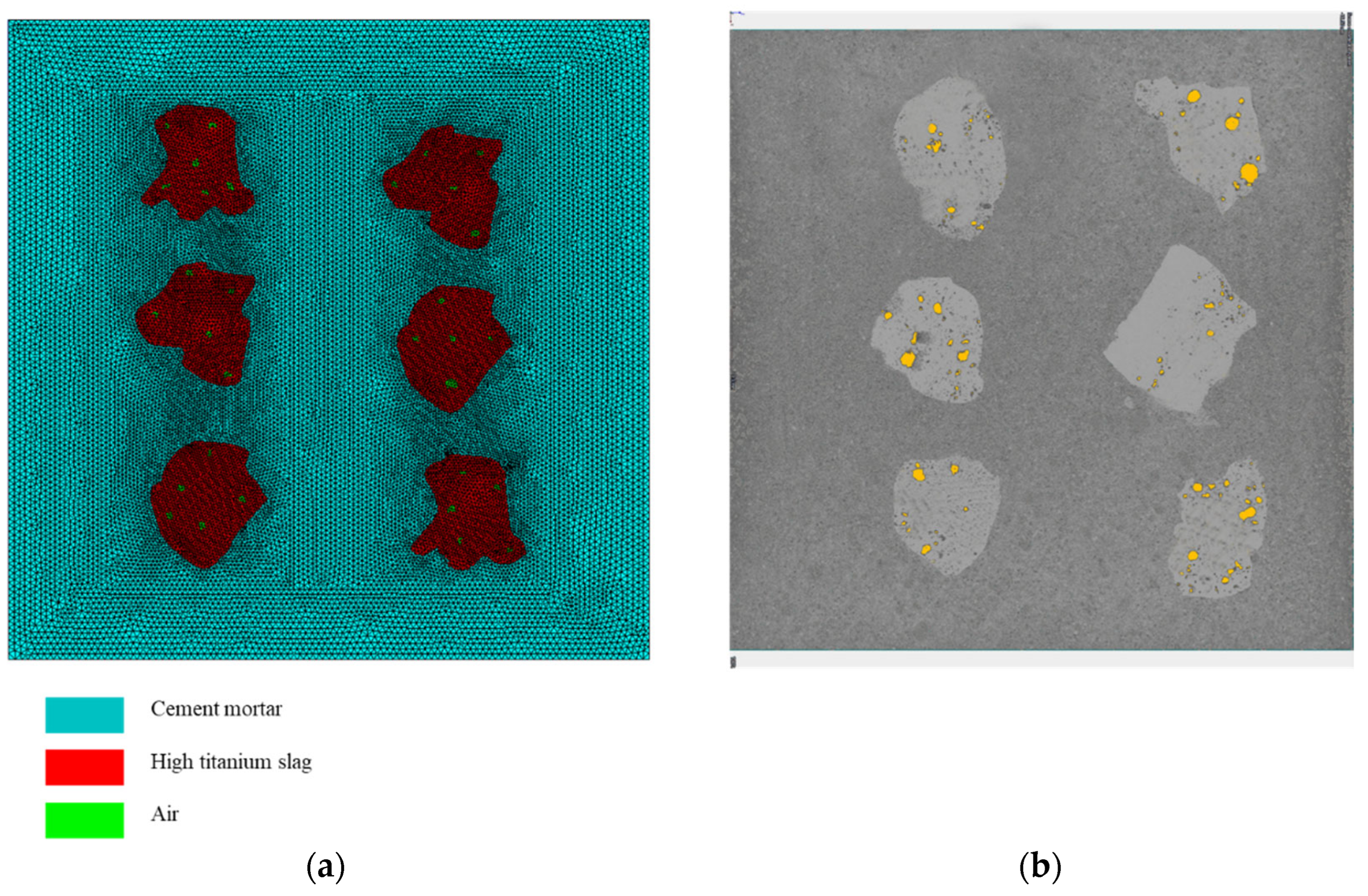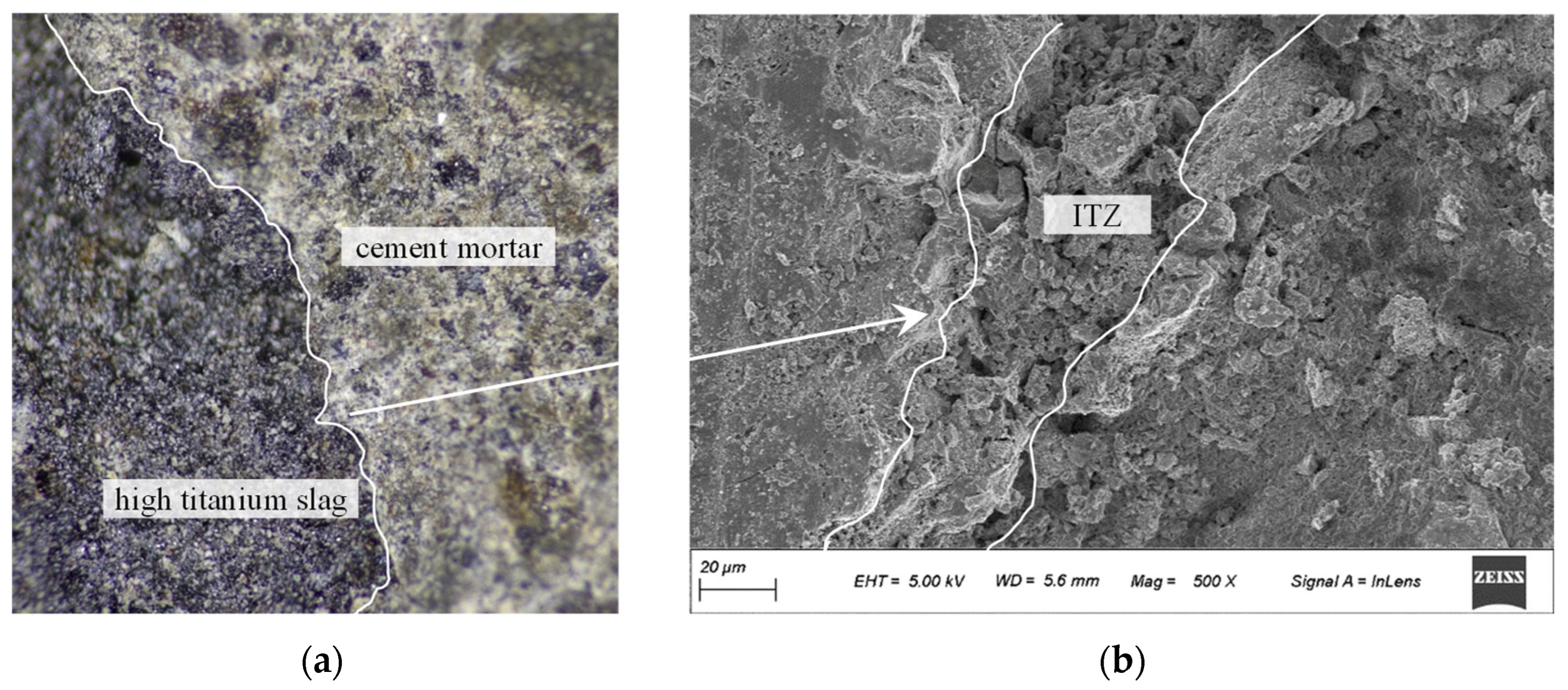 - Zhang, J.; Wang, M.; Sun, J. Mechanical Behavior and Fracture Mechanisms of High-Strength Concrete Incorporating Porous Titanium Slag Aggregate. J. Mater. Res. Technol. 2025, 36, 6075–6087. [Google Scholar] [CrossRef]