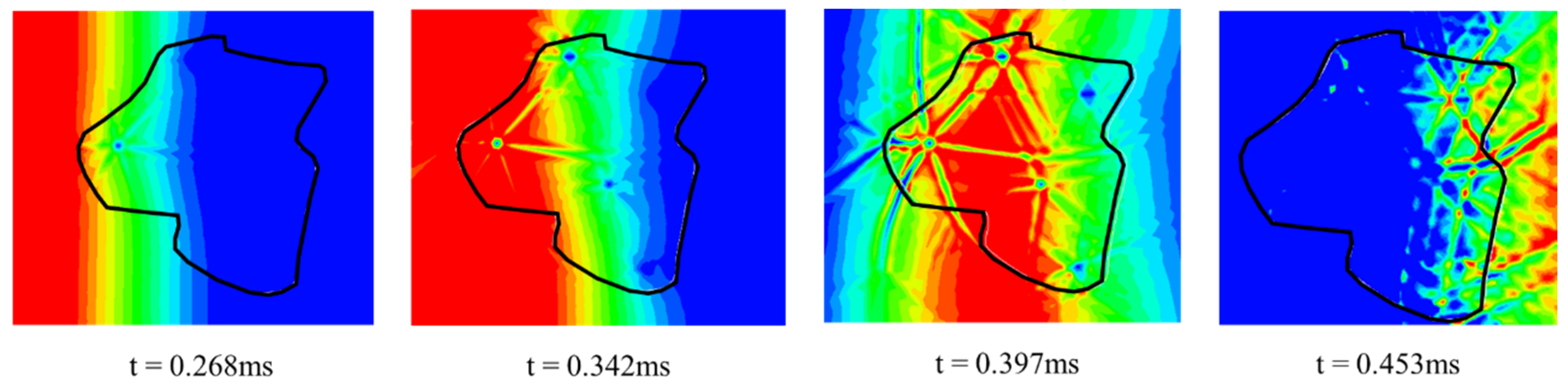 - Wan, D.; Wang, M.; Zhu, Z.; Wang, F.; Zhou, L.; Liu, R.; Gao, W.; Shu, Y.; Xiao, H. Coupled GIMP and CPDI Material Point Method in Modelling Blast-Induced Three-Dimensional Rock Fracture. Int. J. Min. Sci. Technol. 2022, 32, 1097–1114. [Google Scholar] [CrossRef]