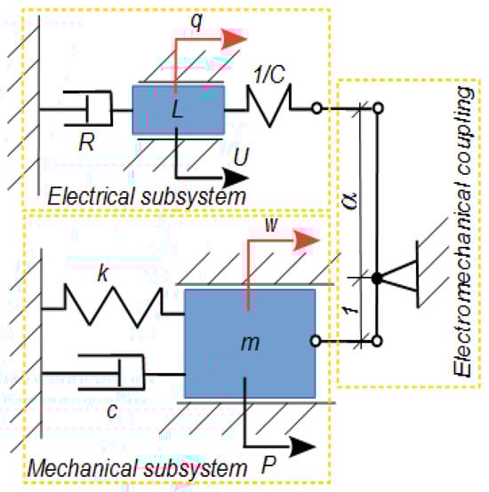 The second subsystem describes the electrical domain, reflecting both the inherent properties of the piezoelectric patch and any additional components (e.g., amplifier or energy harvester). The generalized coordinate q denotes the electric charge, or equivalently, the current in the circuit. The primary electrical parameters include the following: