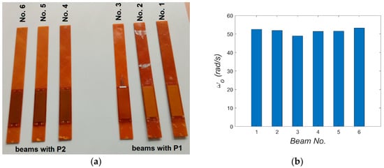 The research object taken for the tests comprised six-layer beams ([±45/90]S) made from a glass–epoxy laminate. The material properties and geometric dimensions of the beams are detailed in [8]. Specifically, a composite square plate with a side of about 90 cm was produced in an autoclave, from which two sets of beams were cut. The beams were cut by machine (water jet cutting) from the central part of the plate, where the thickness has the smallest deviations. In principle, all beams were intended to have identical properties, including geometry, with cantilever length, width, and thickness equal to 316 mm, 34 mm, and 1.8 mm, respectively. Subsequently, M8528-P1 or M8528-P2 patches were bonded onto the beams, resulting in two sets: three beams with P1 patches and three beams with P2 patches (see Figure 2a). Using modal analysis, the first bending natural frequencies of all beams with embedded MFC elements were compared. During these tests, the beams were clamped in such a way that the engagement of clamping elements remained in each test. The beam was excited using the PCB 086D80 modal hammer, and its response was recorded by the PCB 352A24 accelerometer attached to its end. Both signals were analyzed using Scadas Mobile analyzer and Simcenter TestLab v2021 software. The obtained results are summarized in Figure 2b. Modal analysis confirmed that the properties were consistent across samples, with the error in the first natural frequency not exceeding 8%. Beams with the closest natural frequencies were selected for comparative studies. The choice fell on beams No. 2 with element P1 and No. 5 with element P2. Two types of experiments (TEST 1 and TEST 2) were conducted on these beams exhibiting the closest mechanical properties.