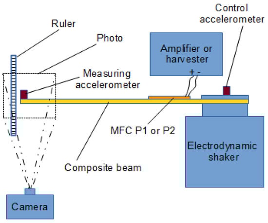 A schematic of the test setup is shown in Figure 3. The right side of the schematic depicts the amplifier (used in TEST 1), the electrodynamic shaker, and the harvester (used in TEST 2). The left side illustrates the method of measuring the beam response. During the first static test, the deflection of the beam tip was measured under the application of a constant voltage U to the MFC patch (actuator mode). The constant voltage from the signal generator was amplified (1:200) by the HVA1500/50-3 amplifier and used to power the piezoelectric element, which generates the beam’s deformation. The deflection was recorded using the D5000 Nikon camera (Nikon Corporation, Tokyo, Japan), and the applied voltage was monitored via the AX-18B Axiomet multimeter at the amplifier input. The camera images were analyzed using Tema v3.8 software, and a ruler was used as a reference for pixel-to-millimeter scaling. In the second, dynamic test, the beam vibrations were excited using the Tira TV50101 electrodynamic shaker, which induced voltage in the MFC patch (harvester mode). The voltage across the harvester resistor UR was recorded after using a voltage divider (5:1 or 25:1) through the voltage input of Scadas Mobile, while the beam vibrations were measured with the PCB 352A24 accelerometer. The electrodynamic shaker was controlled in a closed-loop feedback system, using a second PCB 352A24 accelerometer glued to the shaker armature as the control sensor ashaker(t). Since the accelerometer measures absolute acceleration ẅabsolute(t), but the relative acceleration ẅrelative(t) is required for calculations, the following relation applies [13]: