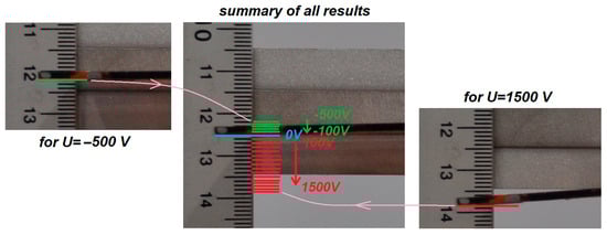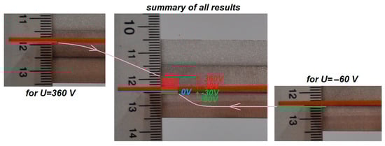 In TEST 1, the voltage applied to the piezoelectric elements P1 or P2 was incrementally varied using an amplifier. These elements operate over different voltage ranges: from −500 V to +1500 V for type P1, and from −60 V to +360 V for type P2 [7]. During the tests, the voltage was increased from minimum to maximum in steps of 100 V for P1 and 30 V for P2. At each voltage level, photographs of the beam tip position were taken. To facilitate accurate measurements, a ruler was positioned near the beam tip, serving as a reliable reference scale. A series of photographs was collected for both types of elements. The paper presents one representative photograph each for the systems with P1 and P2 patches, showing the equilibrium position at 0 V in the middle image in Figure 4 and Figure 5. Horizontal lines indicating beam tip positions in the next photos were added to these images with 0 V, while vertical arrows denote the direction of the amplifier voltage change (red lines − positive voltages, green lines − negative voltages). In addition, the maximum and minimum beam tip position at extreme voltages U is visualized in the right and left sides of Figure 4 and Figure 5.